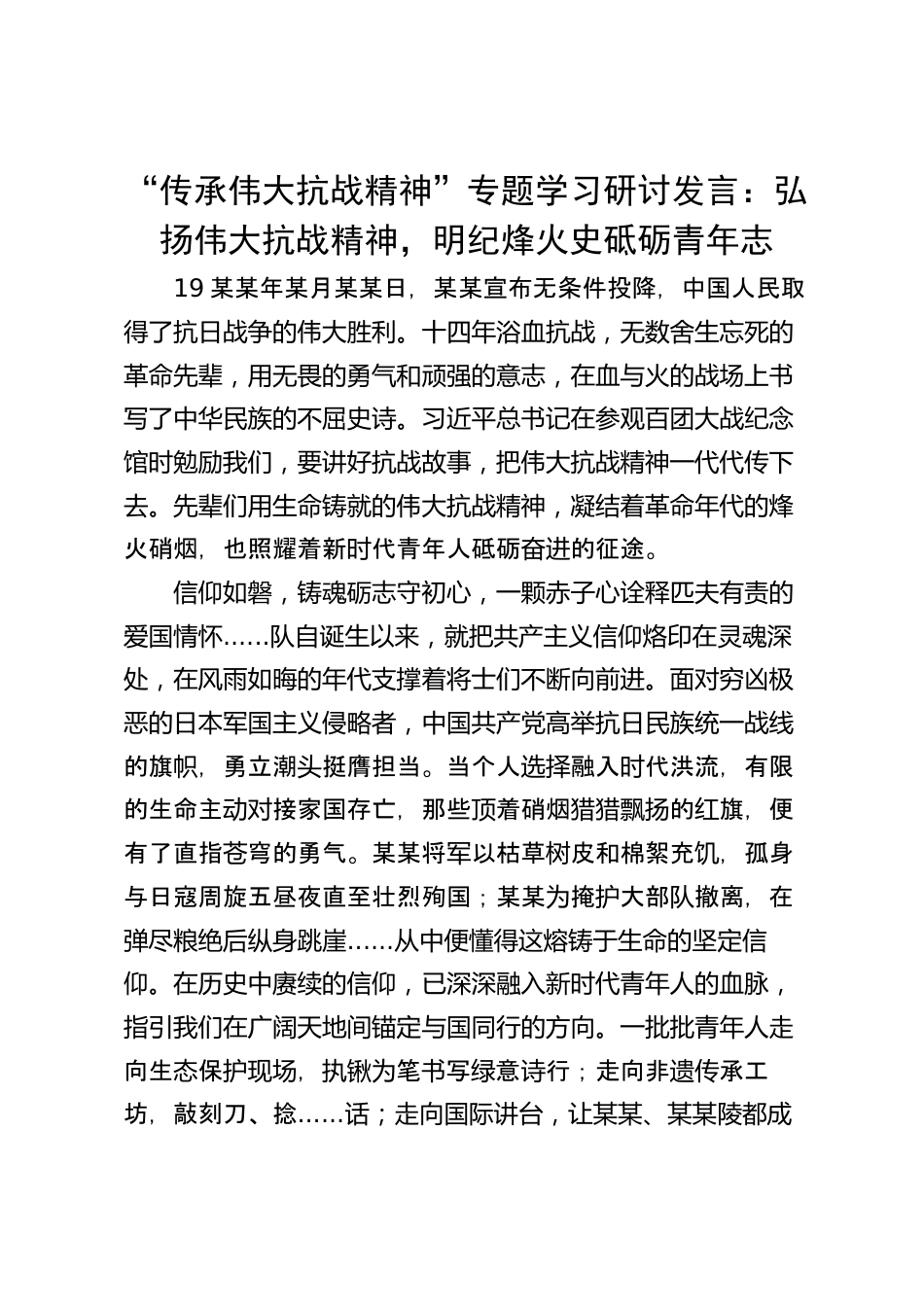 “傳承偉大抗戰(zhàn)精神”專(zhuān)題學(xué)習(xí)研討發(fā)言:弘揚(yáng)偉大抗戰(zhàn)精神,明紀(jì)烽火史砥礪青年志19某某年某月某某日,某某宣布無(wú)條件投降,中國(guó)人民取得了抗日戰(zhàn)爭(zhēng)的偉大勝利。十四年浴血抗戰(zhàn),無(wú)數(shù)舍生忘死的革命先輩,用無(wú)畏的勇氣和頑強(qiáng)的意志,在血與火的戰(zhàn)場(chǎng)上書(shū)寫(xiě)了中華民族的不屈史詩(shī)。習(xí)近平總書(shū)記在參觀百團(tuán)大戰(zhàn)紀(jì)念館時(shí)勉勵(lì)我們,要講好抗戰(zhàn)故事,把偉大抗戰(zhàn)精神一代代傳下去。先輩們用生命鑄就的偉大抗戰(zhàn)精神,凝結(jié)著革命年代的烽火硝煙,也照耀著新代青年人砥礪的征途。時(shí)奮進(jìn)信仰如磐,鑄魂礪志守初心,一顆赤子心詮釋匹夫有責(zé)的愛(ài)國(guó)情懷......隊(duì)自誕生以來(lái),就把共產(chǎn)主義...