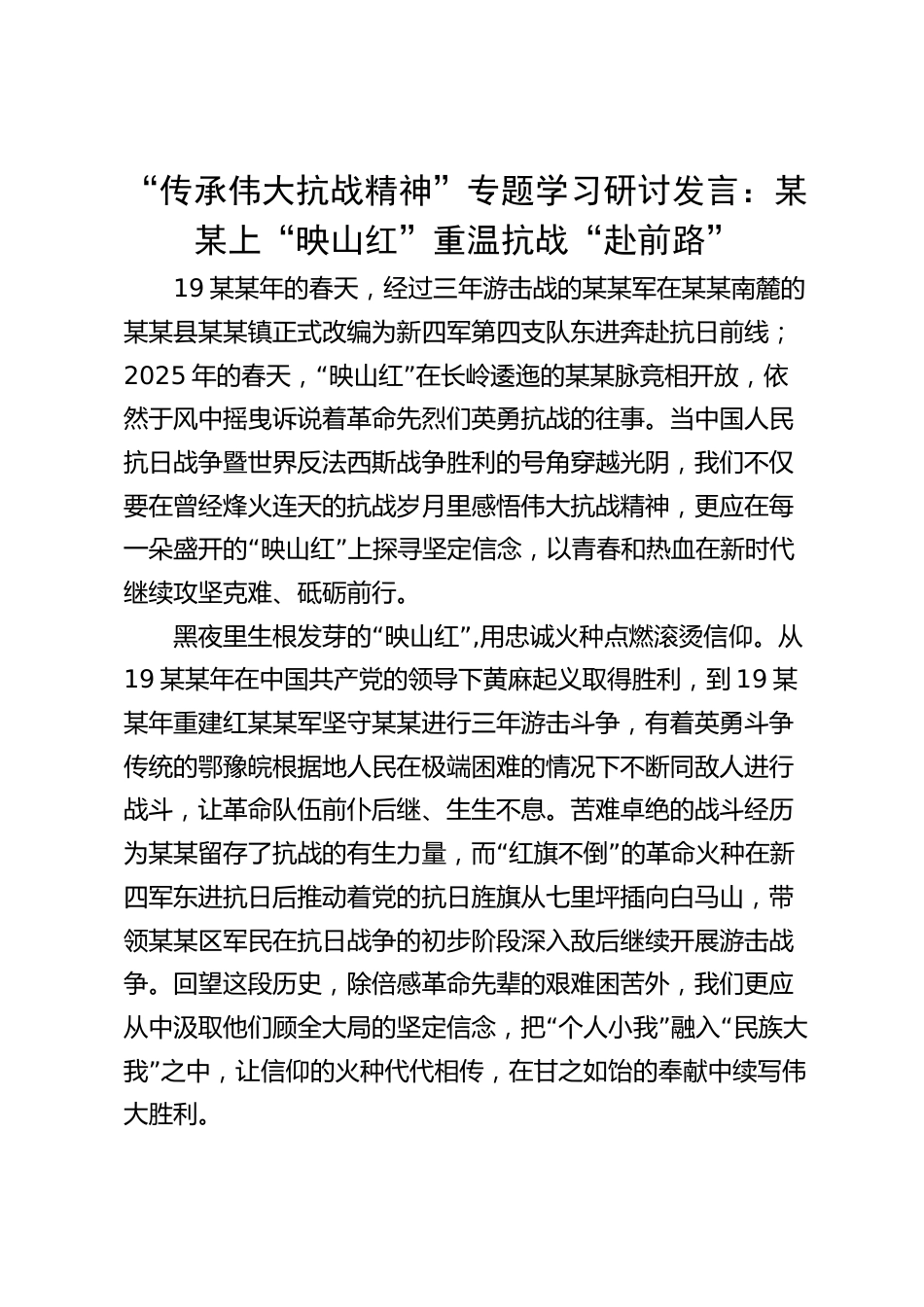 “傳承偉大抗戰(zhàn)精神”專題學(xué)習(xí)研討發(fā)言:某某上“映山紅”重溫抗戰(zhàn)“赴前路”19某某年的春天,經(jīng)過三年游擊戰(zhàn)的某某軍在某某南麓的某某縣某某鎮(zhèn)正式改編為新四軍第四支隊(duì)東進(jìn)奔赴抗日前線;2025“”年的春天,映山紅在長嶺逶迤的某某脈競相開放,依然于風(fēng)中搖曳訴說著革命先烈們英勇抗戰(zhàn)的往事。當(dāng)中國人民抗日戰(zhàn)爭暨世界反法西斯戰(zhàn)爭勝利的號(hào)角穿越光陰,我們不僅要在曾經(jīng)烽火連天的抗戰(zhàn)歲月里感悟偉大抗戰(zhàn)精神,更應(yīng)在每“”一朵盛開的映山紅上探尋堅(jiān)定信念,以青春和熱血在新時(shí)代繼續(xù)攻堅(jiān)克難、砥礪前行?!啊焙谝估锷l(fā)芽的映山紅,用忠誠火種點(diǎn)燃滾燙信仰。從19某...