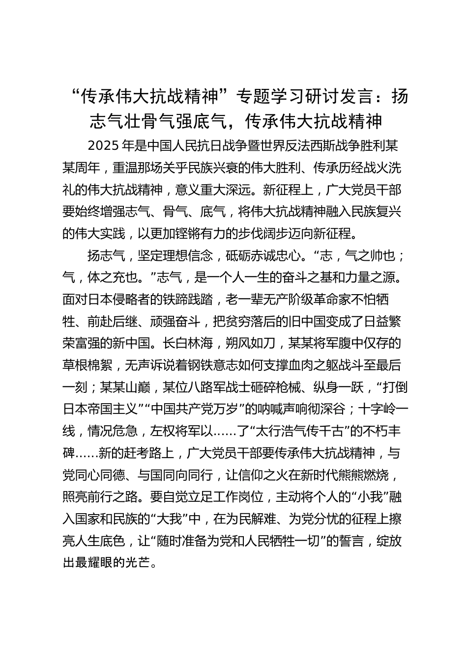 “傳承偉大抗戰(zhàn)精神”專題學習研討發(fā)言:揚志氣壯骨氣強底氣,傳承偉大抗戰(zhàn)精神