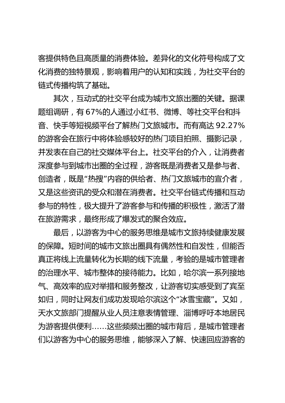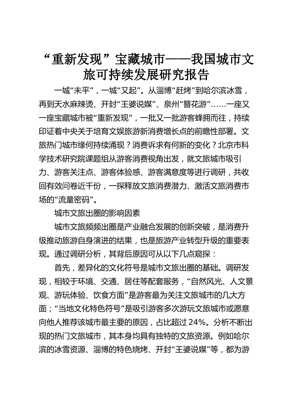 “重新發(fā)現(xiàn)”寶藏城市——我國城市文旅可持續(xù)發(fā)展研究報(bào)告“”“”“”一城未平,一城又起。從淄博趕烤到哈爾濱冰雪,“”“再到天水麻辣燙、開封王婆說媒、泉州簪花游”……一座又“”一座寶藏城市被重新發(fā)現(xiàn),一批又一批游客蜂擁而往,持續(xù)印證著中央關(guān)于培育文娛旅游新消費(fèi)增長點(diǎn)的前瞻性部署。文旅熱門城市緣何持續(xù)涌現(xiàn)?消費(fèi)訴求有何新的變化?北京市科學(xué)技術(shù)研究院課題組從游客消費(fèi)視角出發(fā),就文旅城市吸引力、游客關(guān)注點(diǎn)、游客體驗(yàn)感、游客滿意度等進(jìn)行調(diào)研,共收回有效問卷近千份,一探釋放文旅消費(fèi)潛力、激活文旅消費(fèi)市“”場的流量密碼。城市文旅出圈的影響因...