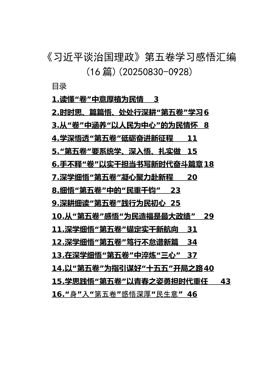 《習近平談治國理政》第五卷學習感悟匯編(16篇)(20250830-0928)目錄1.“”讀懂卷中意厚植為民情32.“”時時思、篇篇悟、處處行深耕第五卷學習63.“”“”從卷中涵養(yǎng)以人民為中心的為民情懷84.“”學深悟透第五卷砥礪奮進新征程115.“”第五卷要系統(tǒng)學、深入悟、扎實做156.“”手不釋卷以實干擔當書寫新時代奮斗篇章187.“”深學細悟第五卷凝心聚力赴新程208.“”“細悟第五卷中的民重千鈞”239.“”深耕細讀第五卷踐行為民初心2510.“”“從第五卷感悟為民造福是最大政績”2911.“”深學細悟第五卷錨定實干新航向3112.“”深學細悟第五卷篤行不怠譜新篇3413.“”“在深學...