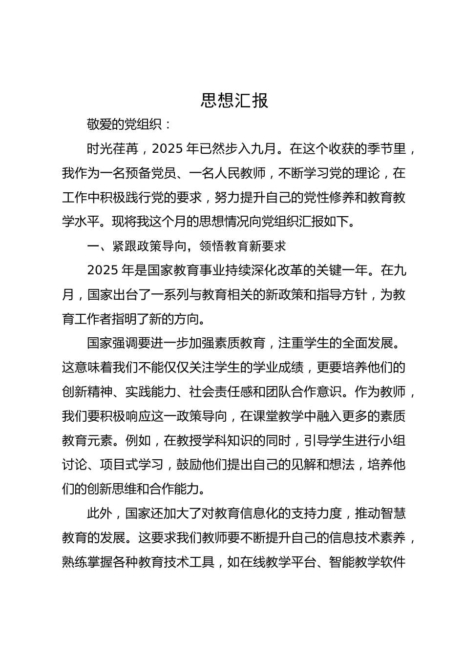 思想?yún)R報敬愛的黨組織:時光荏苒,2025年已然步入九月。在這個收獲的季節(jié)里,我作為一名預(yù)備黨員、一名人民教師,不斷學(xué)習(xí)黨的理論,在工作中積極踐行黨的要求,努力提升自己的黨性修養(yǎng)和教育教學(xué)水平?,F(xiàn)將我這個月的思想情況向黨組織匯報如下。一、緊跟政策導(dǎo)向,領(lǐng)悟教育新要求2025年是國家教育事業(yè)持續(xù)深化改革的關(guān)鍵一年。在九月,國家出臺了一系列與教育相關(guān)的新政策和指導(dǎo)方針,為教育工作者指明了新的方向。國家強調(diào)要進(jìn)一步加強素質(zhì)教育,注重學(xué)生的全面發(fā)展。這意味著我們不能僅僅關(guān)注學(xué)生的學(xué)業(yè)成績,更要培養(yǎng)他們的創(chuàng)新精神、實踐能力、社會責(zé)任感和團隊合作...