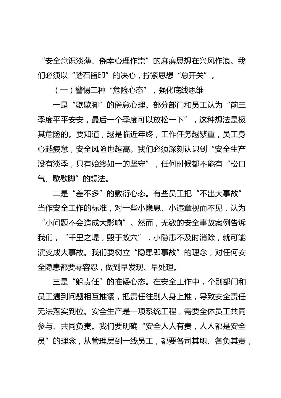 在第四季度安全生產(chǎn)工作專題會議上的講話同志們:第四季度已然來臨,這是全年安全生產(chǎn)的“決勝之役”,更是檢驗我們安全管理成效的“關鍵大考”。安全生產(chǎn),關乎企業(yè)的穩(wěn)定發(fā)展,關乎每一位員工的生命福祉,容不得半點馬虎和懈怠。當前,盡管我們在安全生產(chǎn)方面取得了一定的成績,但個別領域依然存在“思想麻痹的頑疾、措施虛化的弊病、責任缺失的短板”,這些問題就像隱藏在暗處的炸彈,稍有不慎,就可能引發(fā)嚴重的安全事故,讓我們前功盡棄。今天會議的核心任務,就是要以“安全是發(fā)展基石、其他是發(fā)展成果”的深刻認知,守牢“不可觸碰、不可逾越”的安全紅線,以“背...