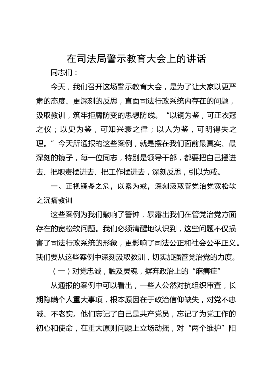 在司法局警示教育大會(huì)上的講話同志們:今天,我們召開(kāi)這場(chǎng)警示教育大會(huì),是為了讓大家以更嚴(yán)肅的態(tài)度、更深刻的反思,直面司法行政系統(tǒng)內(nèi)存在的問(wèn)題,汲取教訓(xùn),筑牢拒腐防變的思想防線?!耙糟~為鑒,可正衣冠之儀;以史為鑒,可知興衰之律;以人為鑒,可明得失之理?!苯裉焖▓?bào)的這些案例,就是擺在我們面前最真實(shí)、最深刻的鏡子,每一位同志,特別是領(lǐng)導(dǎo)干部,都要把自己擺進(jìn)去、把職責(zé)擺進(jìn)去、把工作擺進(jìn)去,深刻反思,引以為戒。一、正視鏡鑒之危,以案為戒,深刻汲取管黨治黨寬松軟之沉痛教訓(xùn)這些案例為我們敲響了警鐘,暴露出我們?cè)诠茳h治黨方面存在的寬松軟問(wèn)題...
