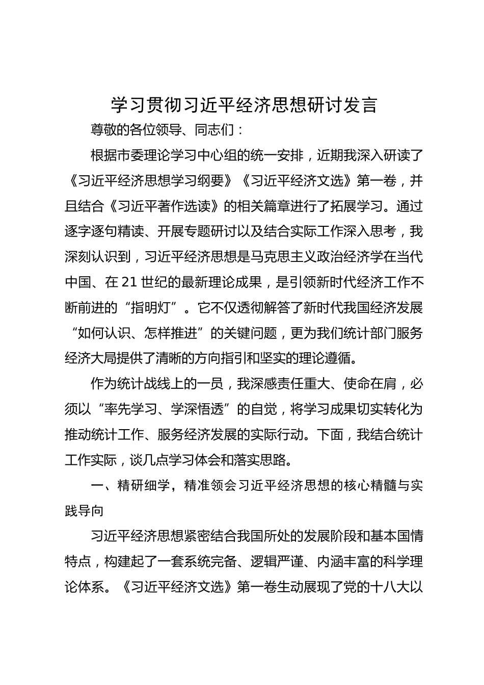 學(xué)習(xí)貫徹習(xí)近平經(jīng)濟(jì)思想研討發(fā)言尊敬的各位領(lǐng)導(dǎo)、同志們:根據(jù)市委理論學(xué)習(xí)中心組的統(tǒng)一安排,近期我深入研讀了《習(xí)近平經(jīng)濟(jì)思想學(xué)習(xí)綱要》《習(xí)近平經(jīng)濟(jì)文選》第一卷,并且結(jié)合《習(xí)近平著作選讀》的相關(guān)篇章進(jìn)行了拓展學(xué)習(xí)。通過逐字逐句精讀、開展專題研討以及結(jié)合實(shí)際工作深入思考,我深刻認(rèn)識(shí)到,習(xí)近平經(jīng)濟(jì)思想是馬克思主義政治經(jīng)濟(jì)學(xué)在當(dāng)代中國(guó)、在21世紀(jì)的最新理論成果,是引領(lǐng)新時(shí)代經(jīng)濟(jì)工作不斷前進(jìn)的“指明燈”。它不僅透徹解答了新時(shí)代我國(guó)經(jīng)濟(jì)發(fā)展“如何認(rèn)識(shí)、怎樣推進(jìn)”的關(guān)鍵問題,更為我們統(tǒng)計(jì)部門服務(wù)經(jīng)濟(jì)大局提供了清晰的方向指引和堅(jiān)實(shí)的理論遵循。作為...