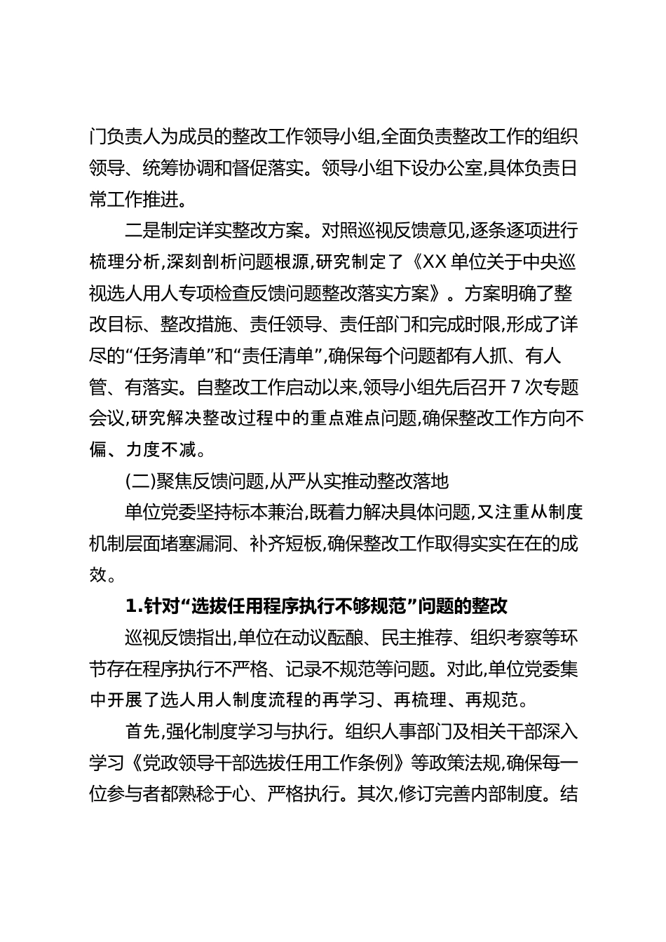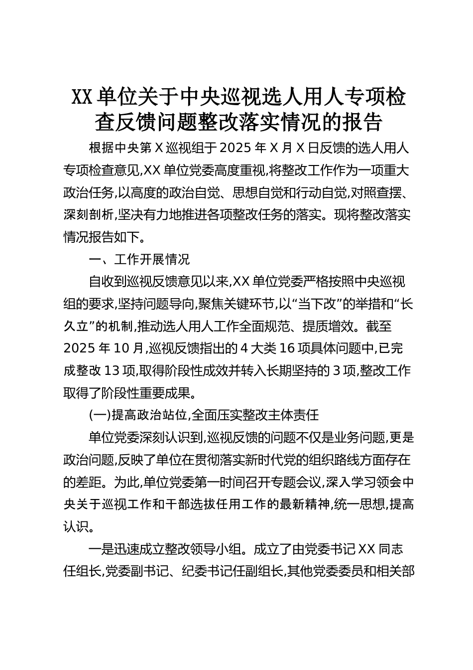 XX單位關(guān)于中央巡視選人用人專項(xiàng)檢查反饋問題整改落實(shí)情況的報(bào)告根據(jù)中央第X巡視組于2025年X月X日反饋的選人用人專項(xiàng)檢查意見,XX單位黨委高度重視,將整改工作作為一項(xiàng)重大政治任務(wù),以高度的政治自覺、思想自覺和行動(dòng)自覺,對(duì)照查擺、深刻剖析,堅(jiān)決有力地推進(jìn)各項(xiàng)整改任務(wù)的落實(shí)?,F(xiàn)將整改落實(shí)情況報(bào)告如下。一、工作開展情況自收到巡視反饋意見以來,XX單位黨委嚴(yán)格按照中央巡視組的要求,堅(jiān)持問題導(dǎo)向,聚焦關(guān)鍵環(huán)節(jié),“”“以當(dāng)下改的舉措和長”久立的機(jī)制,推動(dòng)選人用人工作全面規(guī)范、提質(zhì)增效。截至2025年10月,巡視反饋指出的4大類16項(xiàng)具體問題中,已完成整改13項(xiàng),取得階段...