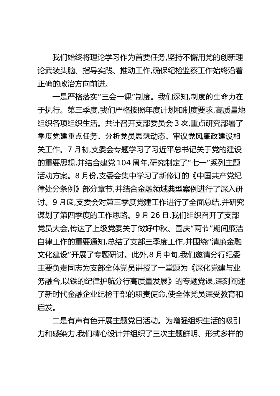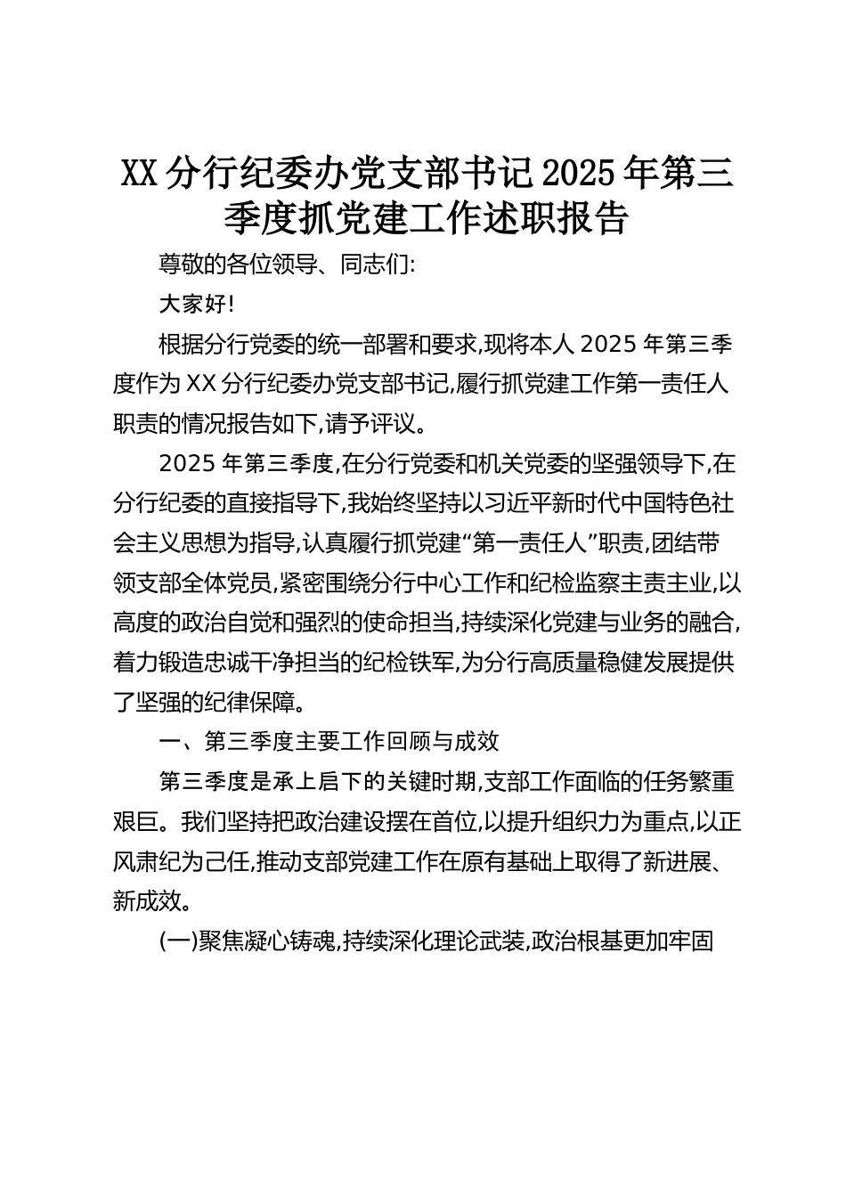 XX分行紀(jì)委辦黨支部書記2025年第三季度抓黨建工作述職報(bào)告