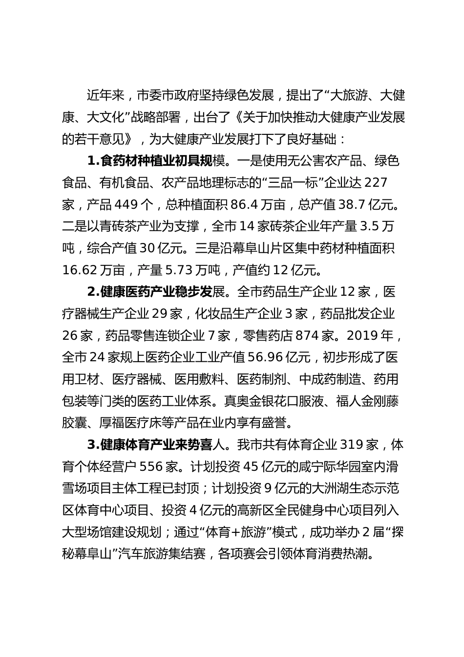 Xx市大健康產(chǎn)業(yè)發(fā)展的現(xiàn)狀和對(duì)策探討“”根據(jù)市委六大活動(dòng)部署,為找尋加快打造咸寧大健康產(chǎn)業(yè)增長(zhǎng)極的思路,市衛(wèi)健委組織專(zhuān)班赴云南省考察了大健康產(chǎn)業(yè)發(fā)展經(jīng)驗(yàn),深入通城縣中醫(yī)藥產(chǎn)業(yè)園、梓山湖大健康產(chǎn)業(yè)示范園區(qū)、咸安生物醫(yī)藥產(chǎn)業(yè)園開(kāi)展調(diào)研座談,與海王德明、真奧、厚福、領(lǐng)康等一批本地醫(yī)藥企業(yè),以及市直衛(wèi)生健康服務(wù)機(jī)構(gòu)、麻塘風(fēng)濕、美年大健康等民營(yíng)醫(yī)療機(jī)構(gòu)主要負(fù)責(zé)人、部分皮膚病患者代表深入交流,分別向高新區(qū)、經(jīng)信、農(nóng)業(yè)、民政、市場(chǎng)監(jiān)管、體育、文旅等部門(mén)取經(jīng),現(xiàn)就我市大健康產(chǎn)業(yè)的基本現(xiàn)狀和發(fā)展對(duì)策思考報(bào)告如下:一、大健康產(chǎn)業(yè)處于快速成長(zhǎng)期健康...