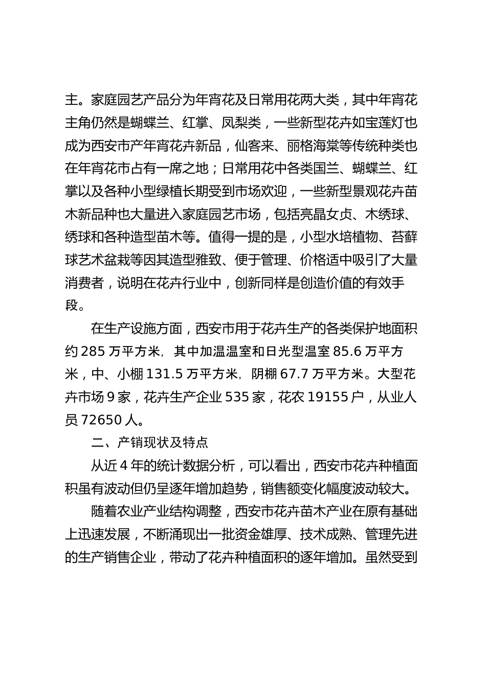 Xx市花卉產(chǎn)業(yè)發(fā)展調(diào)查及對(duì)策建議隨著社會(huì)經(jīng)濟(jì)的不斷發(fā)展和人民生活水平的不斷提高,花卉對(duì)生活環(huán)境的改善作用越來(lái)越明顯,越來(lái)越多的人開(kāi)始關(guān)注花卉,西安市著力打造以長(zhǎng)安區(qū)為重點(diǎn)的省級(jí)花卉產(chǎn)業(yè)示范區(qū)取得了積極成效。在提高城市綠化建設(shè)用花卉生產(chǎn)水平的基礎(chǔ)上,家庭個(gè)人花卉消費(fèi)及網(wǎng)絡(luò)銷售異軍突起,成為西安市花卉產(chǎn)業(yè)發(fā)展新的增長(zhǎng)點(diǎn)。同時(shí),西安市花卉基地建設(shè)不斷完善,品種不斷增多且質(zhì)量提升明顯,部分優(yōu)質(zhì)產(chǎn)品在全國(guó)市場(chǎng)占有率有所提高。總體來(lái)看,西安花卉產(chǎn)業(yè)較集中于沿秦嶺山北麓一帶,主要為東起藍(lán)田、西至周至的狹長(zhǎng)地帶,目前以長(zhǎng)安區(qū)、鄠邑區(qū)、周至縣等...