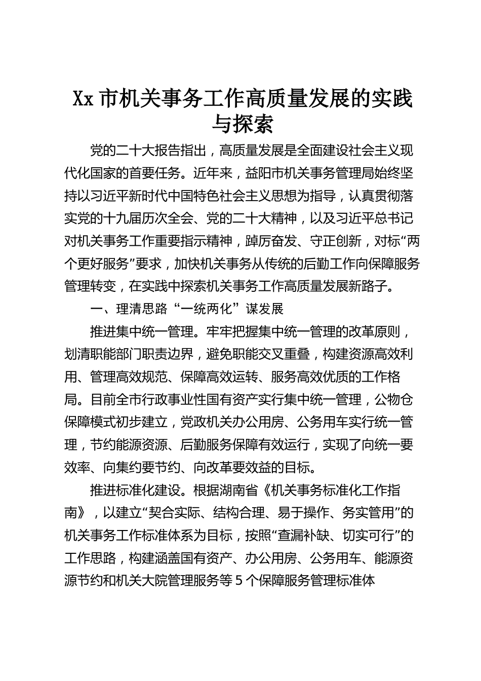 Xx市機(jī)關(guān)事務(wù)工作高質(zhì)量發(fā)展的實(shí)踐與探索黨的二十大報(bào)告指出,高質(zhì)量發(fā)展是全面建設(shè)社會(huì)主義現(xiàn)代化國家的首要任務(wù)。近年來,益陽市機(jī)關(guān)事務(wù)管理局始終堅(jiān)持以習(xí)近平新時(shí)代中國特色社會(huì)主義思想為指導(dǎo),認(rèn)真貫徹落實(shí)黨的十九屆歷次全會(huì)、黨的二十大精神,以及習(xí)近平總書記“對(duì)機(jī)關(guān)事務(wù)工作重要指示精神,踔厲奮發(fā)、守正創(chuàng)新,對(duì)標(biāo)兩”個(gè)更好服務(wù)要求,加快機(jī)關(guān)事務(wù)從傳統(tǒng)的后勤工作向保障服務(wù)管理轉(zhuǎn)變,在實(shí)踐中探索機(jī)關(guān)事務(wù)工作高質(zhì)量發(fā)展新路子。一、理清思路“一統(tǒng)兩化”謀發(fā)展推進(jìn)集中統(tǒng)一管理。牢牢把握集中統(tǒng)一管理的改革原則,劃清職能部門職責(zé)邊界,避免職能交叉重...