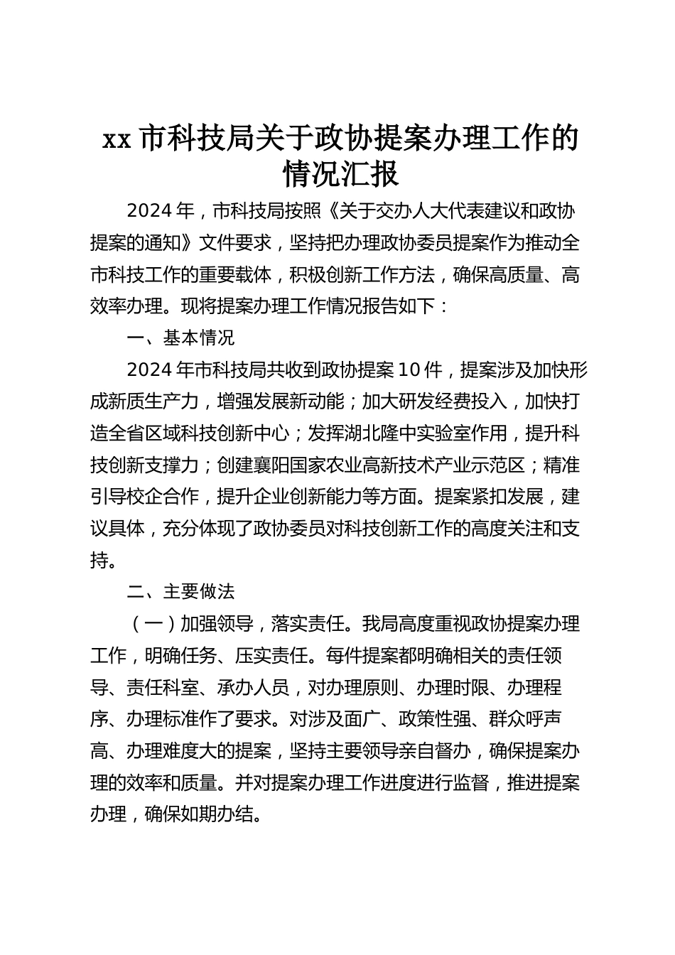 xx市科技局關于政協(xié)提案辦理工作的情況匯報2024年,市科技局按照《關于交辦人大代表建議和政協(xié)提案的通知》文件要求,堅持把辦理政協(xié)委員提案作為推動全市科技工作的重要載體,積極創(chuàng)新工作方法,確保高質(zhì)量、高效率辦理。現(xiàn)將提案辦理工作情況報告如下:一、基本情況2024年市科技局共收到政協(xié)提案10件,提案涉及加快形成新質(zhì)生產(chǎn)力,增強發(fā)展新動能;加大研發(fā)經(jīng)費投入,加快打造全省區(qū)域科技創(chuàng)新中心;發(fā)揮湖北隆中實驗室作用,提升科技創(chuàng)新支撐力;創(chuàng)建襄陽國家農(nóng)業(yè)高新技術產(chǎn)業(yè)示范區(qū);精準引導校企合作,提升企業(yè)創(chuàng)新能力等方面。提案緊扣發(fā)展,建議具體,充分體現(xiàn)了...