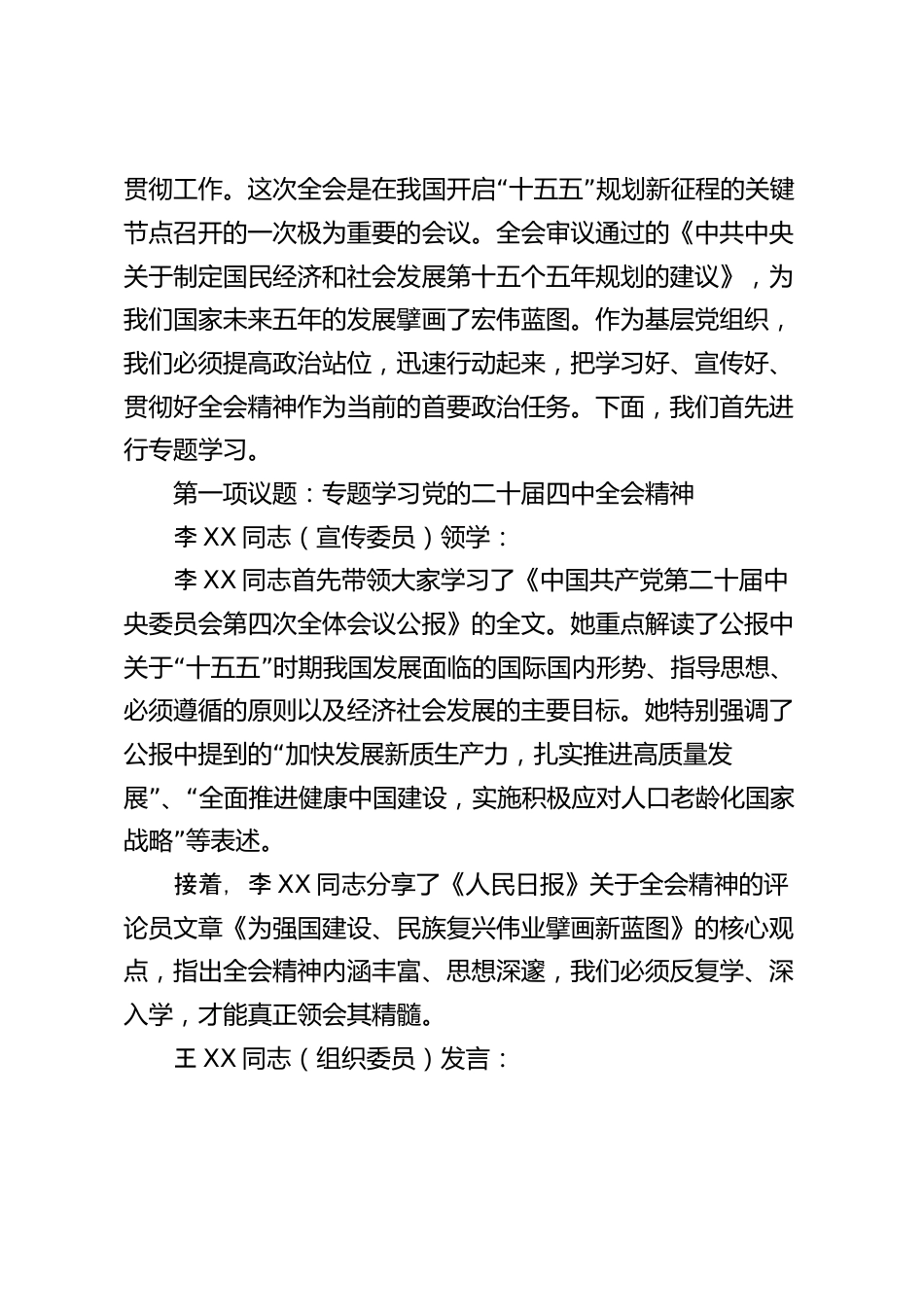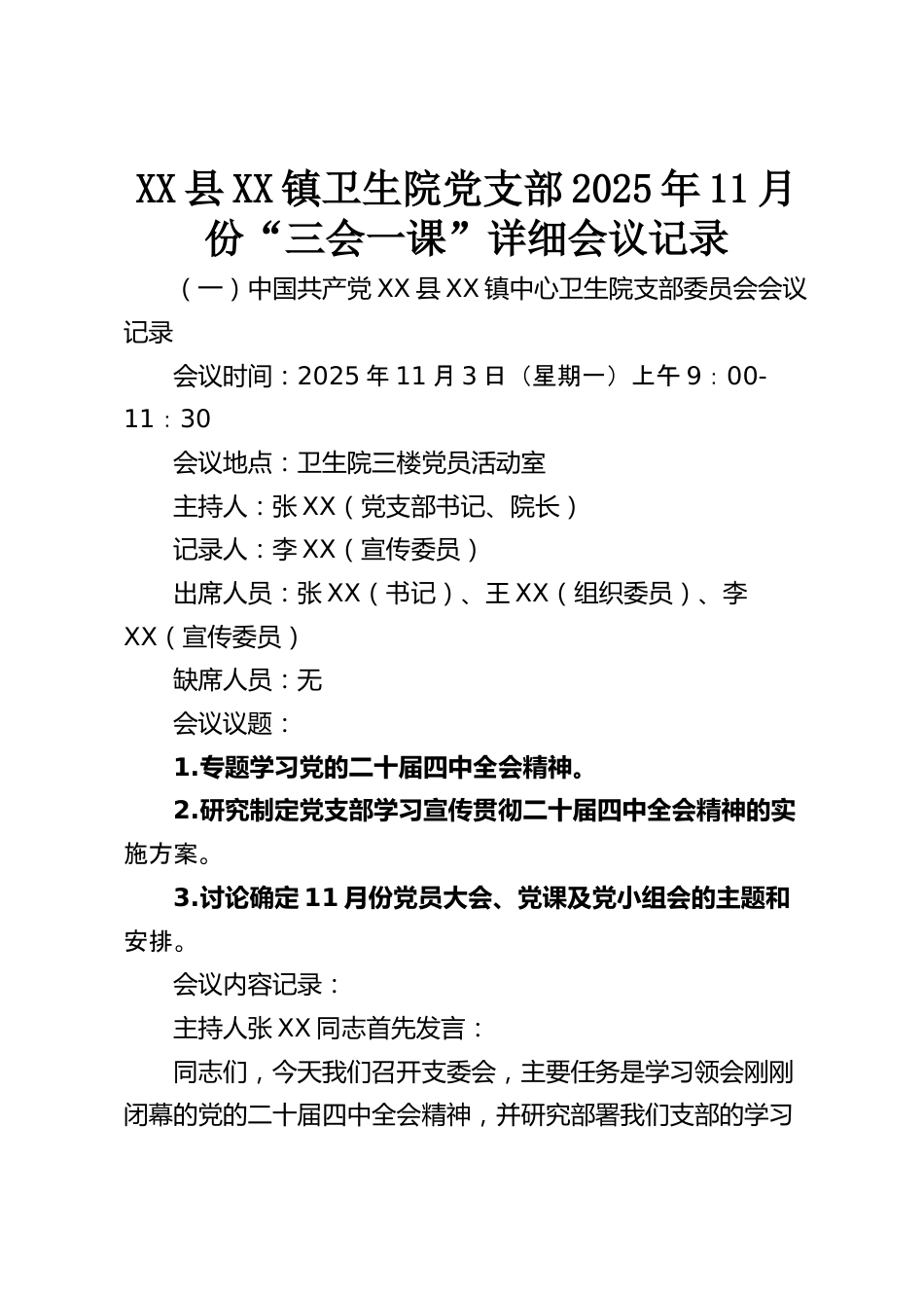 XX縣XX鎮(zhèn)衛(wèi)生院黨支部2025年11月份“三會一課”詳細會議記錄(一)中國共產(chǎn)黨XX縣XX鎮(zhèn)中心衛(wèi)生院支部委員會會議記錄會議時間:2025年11月3日(星期一)上午9:00-11:30會議地點:衛(wèi)生院三樓黨員活動室主持人:張XX(黨支部書記、院長)記錄人:李XX(宣傳委員)出席人員:張XX(書記)、王XX(組織委員)、李XX(宣傳委員)缺席人員:無會議議題:1.專題學習黨的二十屆四中全會精神。2.研究制定黨支部學習宣傳貫徹二十屆四中全會精神的實施方案。3.討論確定11月份黨員大會、黨課及黨小組會的主題和安排。會議內(nèi)容記錄:主持人張XX同志首先發(fā)言:同志們,今天我們召開支...