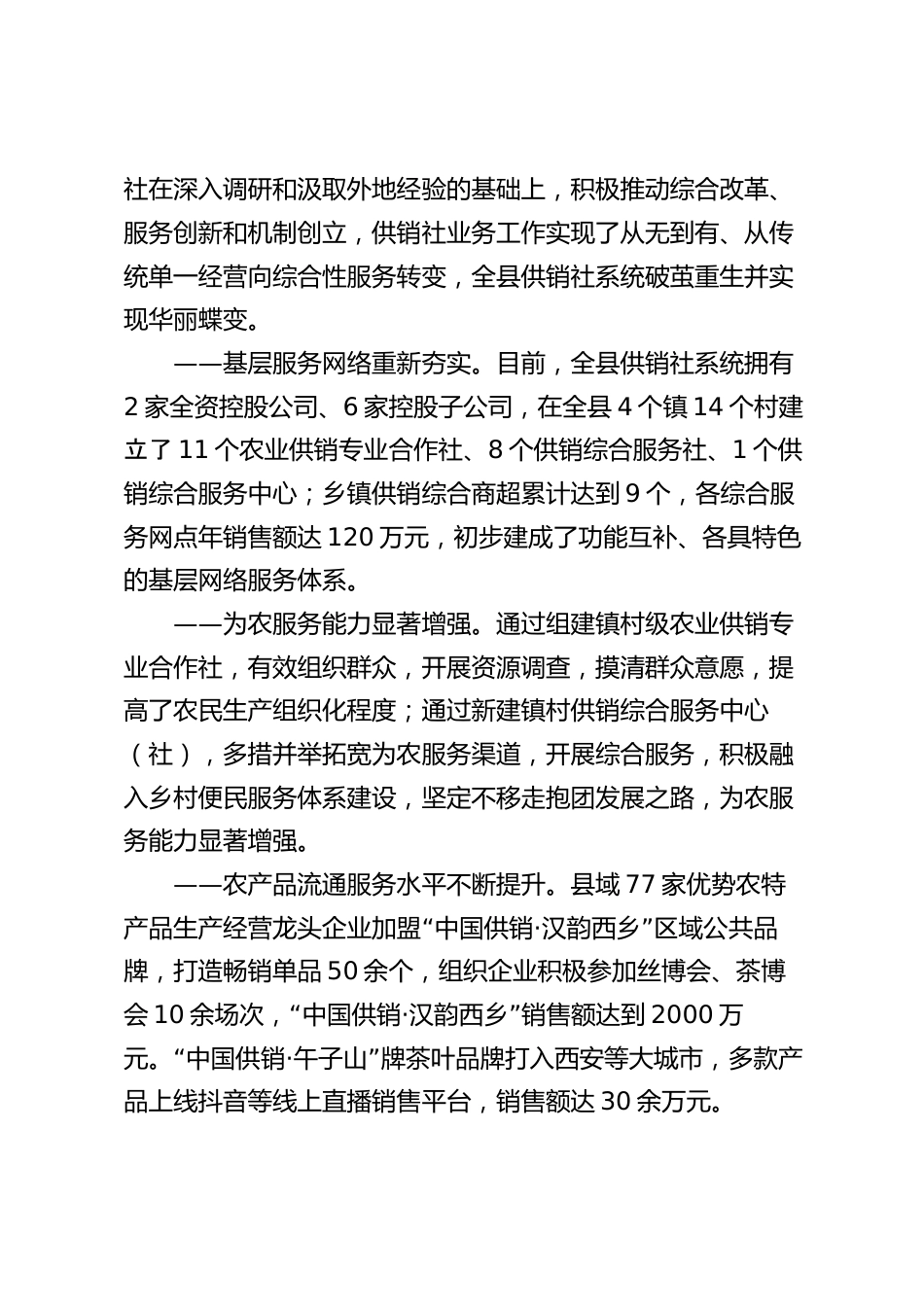 Xx縣供銷合作社綜合改革實踐對我市供銷事業(yè)高質(zhì)量發(fā)展的啟示深化綜合改革拓展服務(wù)領(lǐng)域全力打造漢中特色的現(xiàn)代經(jīng)營服務(wù)體系市政府研究室市供銷合作社深化供銷合作社綜合改革,是黨中央、國務(wù)院從加快推進(jìn)農(nóng)業(yè)農(nóng)村現(xiàn)代化的全局出發(fā)作出的戰(zhàn)略部署,其目的是通過綜“合改革把供銷合作社打造成為服務(wù)農(nóng)民生產(chǎn)生活的綜合平臺,”成為黨和政府密切聯(lián)系農(nóng)民群眾的橋梁紐帶。西鄉(xiāng)縣供銷合作“”“”“社面對無資產(chǎn)、無業(yè)務(wù)、無人員的三無狀況,聚焦合”“”作聯(lián)合兩大關(guān)鍵,以市場化運營、品牌化銷售、數(shù)字化發(fā)展、專業(yè)化管理的方式,重建社有企業(yè)和基層經(jīng)營服務(wù)網(wǎng)點,著力構(gòu)建基...