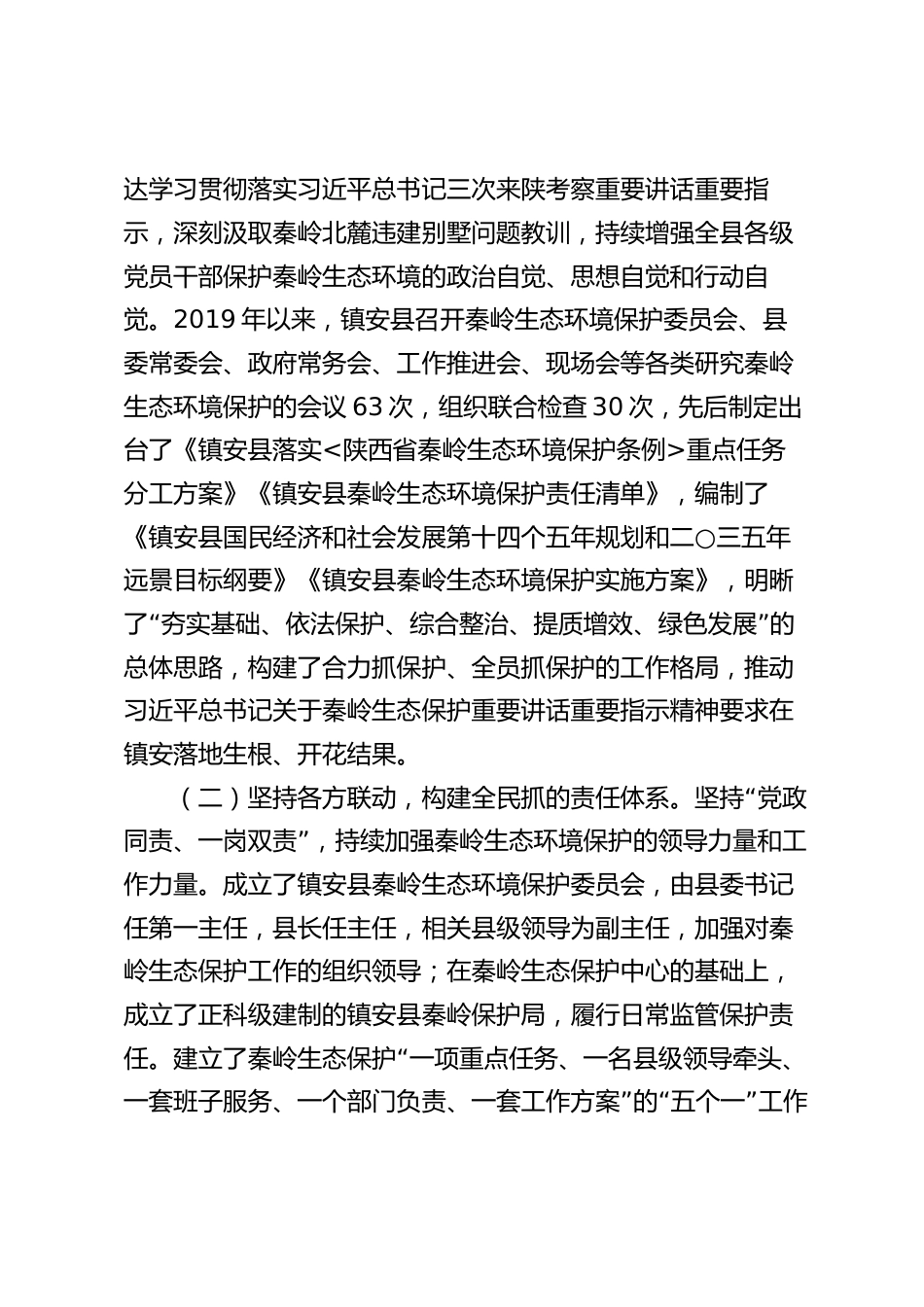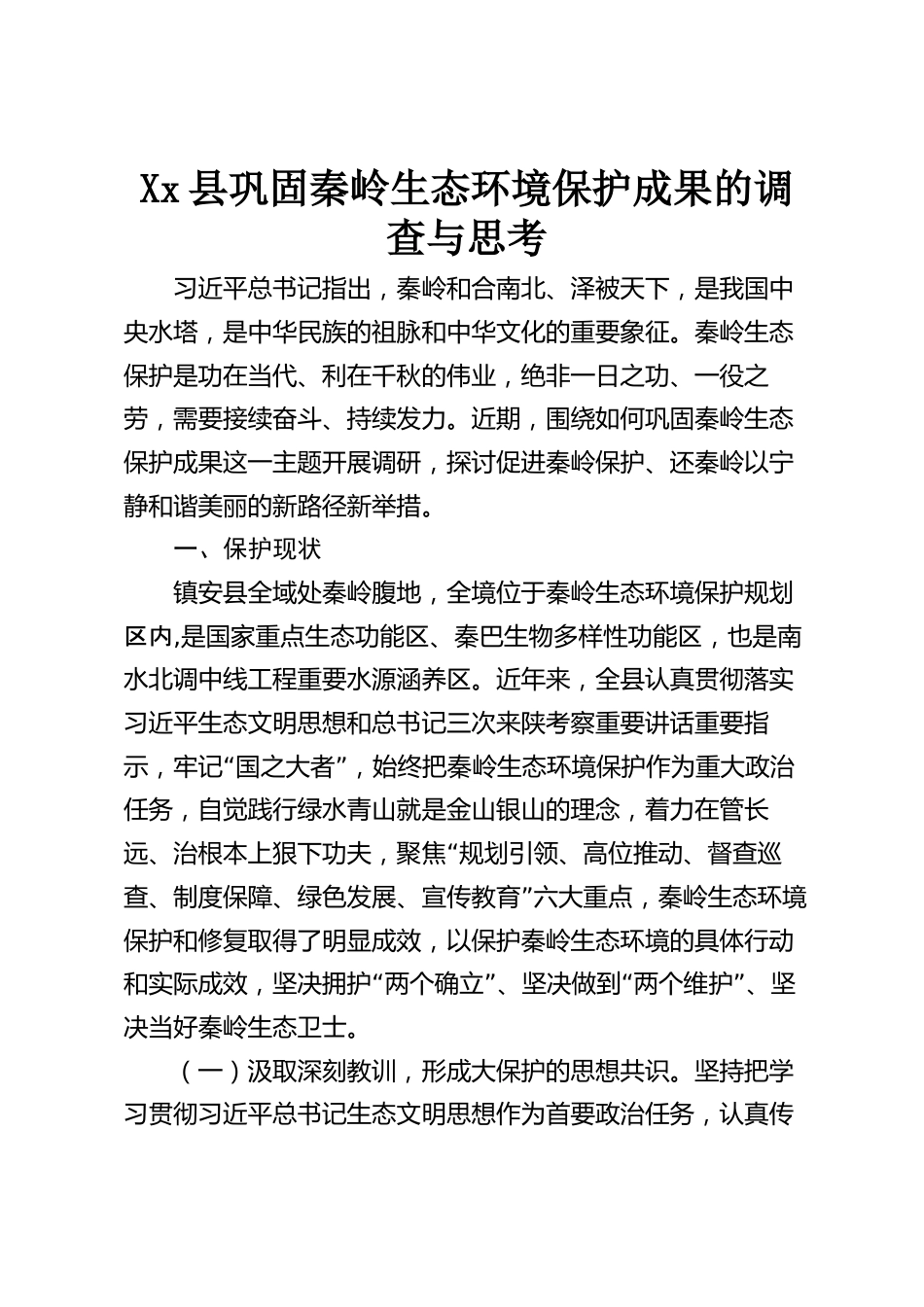 Xx縣鞏固秦嶺生態(tài)環(huán)境保護成果的調(diào)查與思考習近平總書記指出,秦嶺和合南北、澤被天下,是我國中央水塔,是中華民族的祖脈和中華文化的重要象征。秦嶺生態(tài)保護是功在當代、利在千秋的偉業(yè),絕非一日之功、一役之勞,需要接續(xù)奮斗、持續(xù)發(fā)力。近期,圍繞如何鞏固秦嶺生態(tài)保護成果這一主題開展調(diào)研,探討促進秦嶺保護、還秦嶺以寧靜和諧美麗的新路徑新舉措。一、保護現(xiàn)狀鎮(zhèn)安縣全域處秦嶺腹地,全境位于秦嶺生態(tài)環(huán)境保護規(guī)劃區(qū)內(nèi),是國家重點生態(tài)功能區(qū)、秦巴生物多樣性功能區(qū),也是南水北調(diào)中線工程重要水源涵養(yǎng)區(qū)。近年來,全縣認真貫徹落實習近平生態(tài)文明思想和總書記三...
