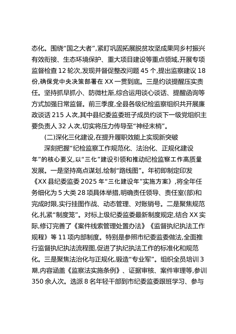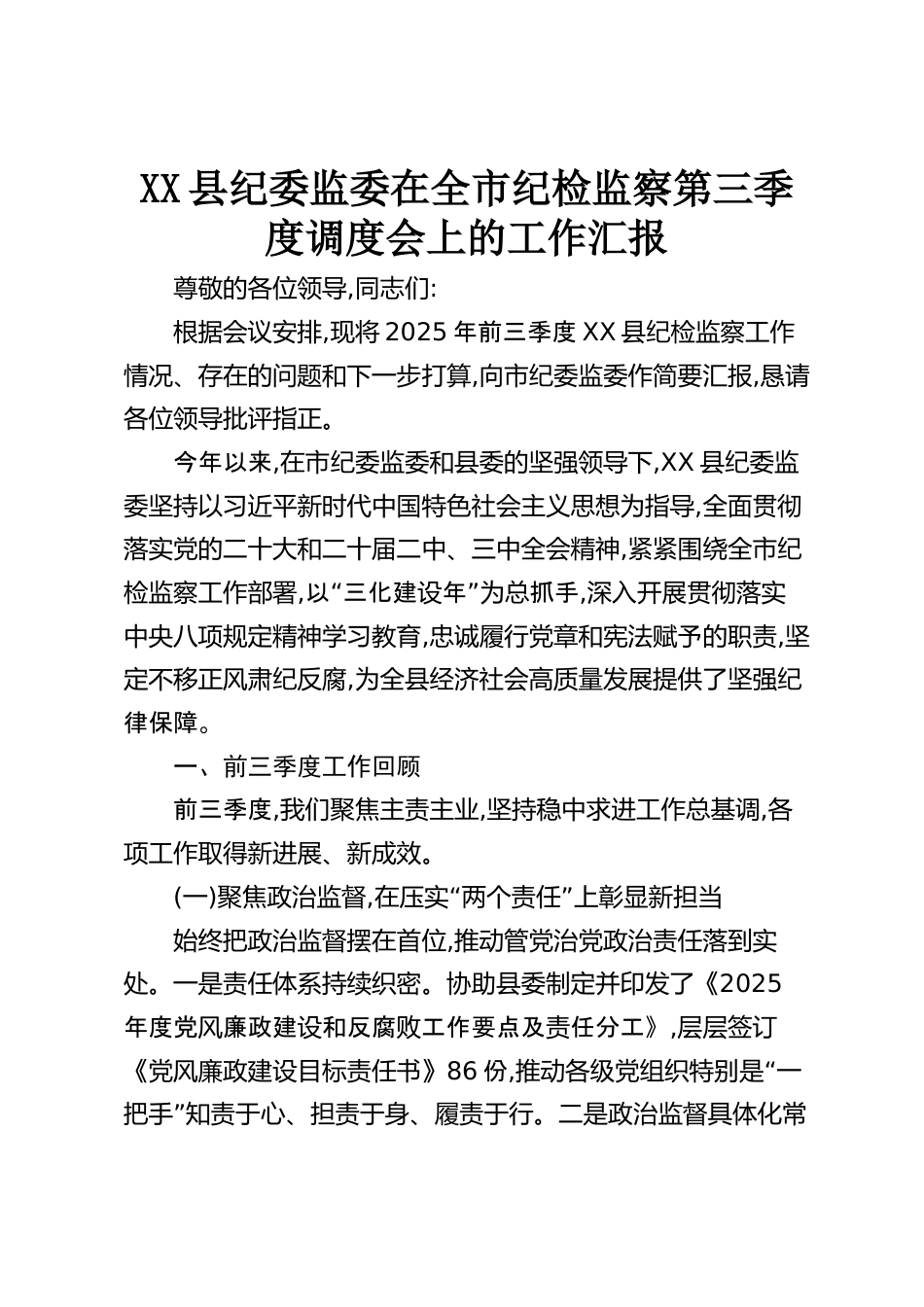 XX縣紀(jì)委監(jiān)委在全市紀(jì)檢監(jiān)察第三季度調(diào)度會(huì)上的工作匯報(bào)尊敬的各位領(lǐng)導(dǎo),同志們:根據(jù)會(huì)議安排,現(xiàn)將2025年前三季度XX縣紀(jì)檢監(jiān)察工作情況、存在的問(wèn)題和下一步打算,向市紀(jì)委監(jiān)委作簡(jiǎn)要匯報(bào),懇請(qǐng)各位領(lǐng)導(dǎo)批評(píng)指正。今年以來(lái),在市紀(jì)委監(jiān)委和縣委的堅(jiān)強(qiáng)領(lǐng)導(dǎo)下,XX縣紀(jì)委監(jiān)委堅(jiān)持以習(xí)近平新時(shí)代中國(guó)特色社會(huì)主義思想為指導(dǎo),全面貫徹落實(shí)黨的二十大和二十屆二中、三中全會(huì)精神,緊緊圍繞全市紀(jì)檢監(jiān)察工作部署,“”以三化建年抓手設(shè)為總,深入開(kāi)展貫徹落實(shí)中央八項(xiàng)規(guī)定精神學(xué)習(xí)教育,忠誠(chéng)履行黨章和憲法賦予的職責(zé),堅(jiān)定不移正風(fēng)肅紀(jì)反腐,為全縣經(jīng)濟(jì)社會(huì)高質(zhì)量發(fā)展提供了堅(jiān)強(qiáng)紀(jì)律保障。...
