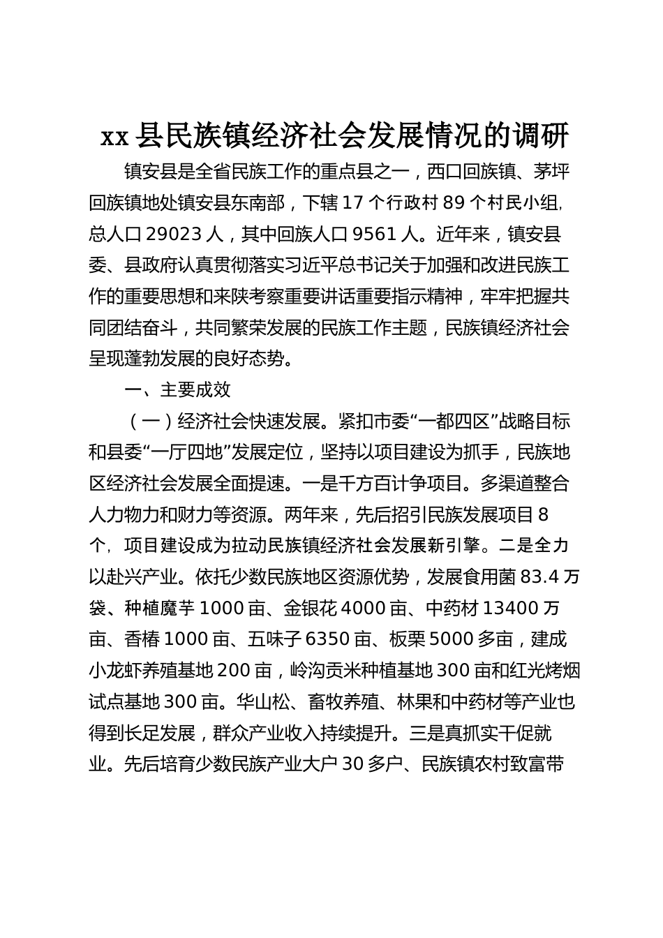 xx縣民族鎮(zhèn)經濟社會發(fā)展情況的調研鎮(zhèn)安縣是全省民族工作的重點縣之一,西口回族鎮(zhèn)、茅坪回族鎮(zhèn)地處鎮(zhèn)安縣東南部,下轄17個行政村89個村民小,組總人口29023人,其中回族人口9561人。近年來,鎮(zhèn)安縣委、縣政府認真貫徹落實習近平總書記關于加強和改進民族工作的重要思想和來陜考察重要講話重要指示精神,牢牢把握共同團結奮斗,共同繁榮發(fā)展的民族工作主題,民族鎮(zhèn)經濟社會呈現(xiàn)蓬勃發(fā)展的良好態(tài)勢。一、主要成效(一)經濟社會快速發(fā)“”展。緊扣市委一都四區(qū)戰(zhàn)略目標“”和縣委一廳四地發(fā)展定位,堅持以項目建設為抓手,民族地區(qū)經濟社會發(fā)展全面提速。一是千方百計爭項...