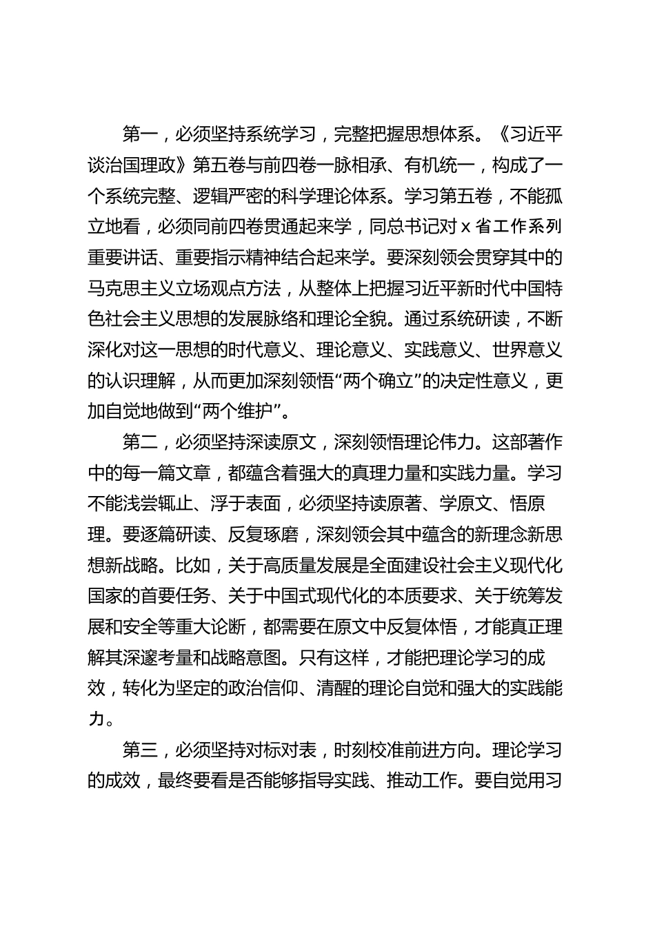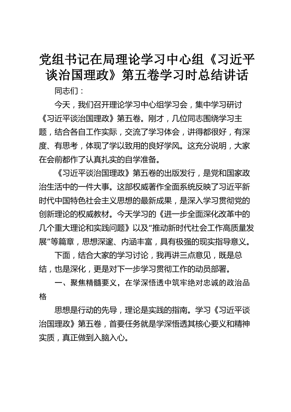 黨組書記在局理論學(xué)習(xí)中心組《習(xí)近平談治國理政》第五卷學(xué)習(xí)時總結(jié)講話同志們:今天,我們召開理論學(xué)習(xí)中心組學(xué)習(xí)會,集中學(xué)習(xí)研討《習(xí)近平談治國理政》第五卷。剛才,幾位同志圍繞學(xué)習(xí)主題,結(jié)合各自工作實際,交流了學(xué)習(xí)體會,講得都很好,有深度、有思考,體現(xiàn)了學(xué)以致用的良好學(xué)風(fēng)。這充分說明,大家在會前都作了認真扎實的自學(xué)準(zhǔn)備。《習(xí)近平談治國理政》第五卷的出版發(fā)行,是黨和國家政治生活中的一件大事。這部權(quán)威著作全面系統(tǒng)反映了習(xí)近平新時代中國特色社會主義思想的最新成果,是深入學(xué)習(xí)貫徹黨的創(chuàng)新理論的權(quán)威教材。今天學(xué)習(xí)的《進一步全面深化改革中的“幾...