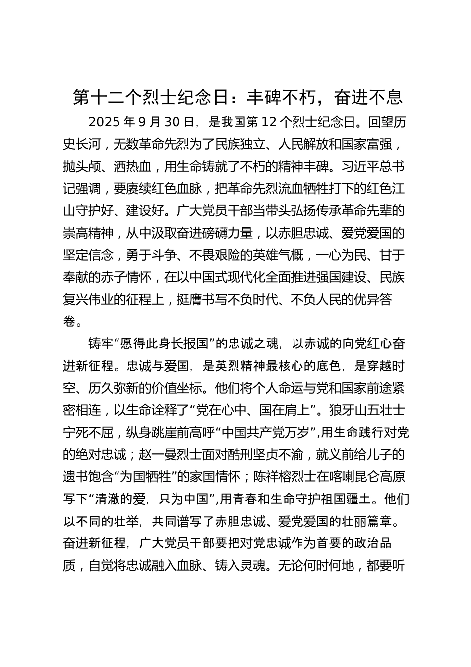 第十二個烈士紀(jì)念日:豐碑不朽,奮進(jìn)不息2025年9月30日,是我國第12個烈士紀(jì)念日?;赝麣v史長河,無數(shù)革命先烈為了民族獨立、人民解放和國家富強,拋頭顱、灑熱血,用生命鑄就了不朽的精神豐碑。習(xí)近平總書記強調(diào),要賡續(xù)紅色血脈,把革命先烈流血犧牲打下的紅色江山守護(hù)好、建設(shè)好。廣大黨員干部當(dāng)帶頭弘揚傳承革命先輩的崇高精神,從中汲取奮進(jìn)磅礴力量,以赤膽忠誠、愛黨愛國的堅定信念,勇于斗爭、不畏艱險的英雄氣概,一心為民、甘于奉獻(xiàn)的赤子情懷,在以中國式現(xiàn)代化全面推進(jìn)強國建設(shè)、民族復(fù)興偉業(yè)的征程上,挺膺書寫不負(fù)時代、不負(fù)人民的優(yōu)異答卷?!啊崩卧傅么?..