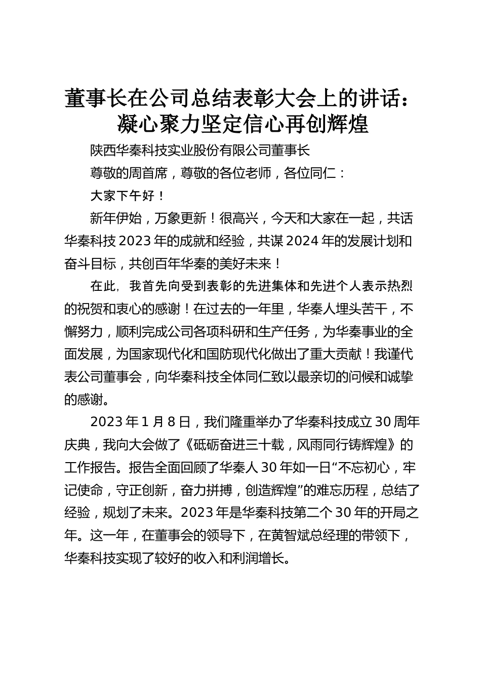 董事長在公司總結表彰大會上的講話:凝心聚力 堅定信心 再創(chuàng)輝煌