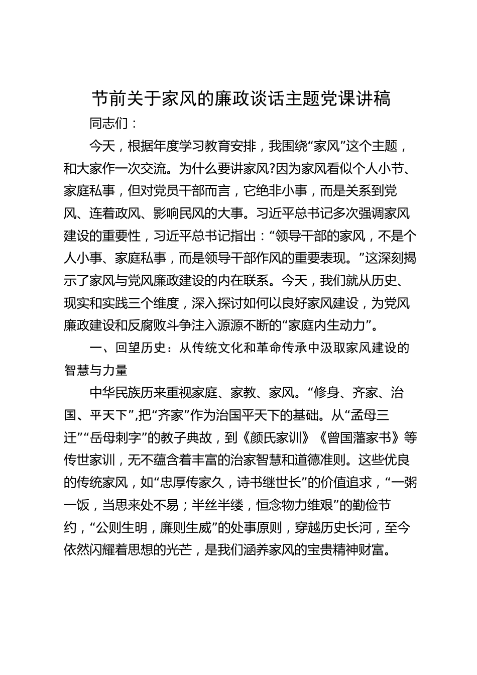 節(jié)前關于家風的廉政談話主題黨課講稿