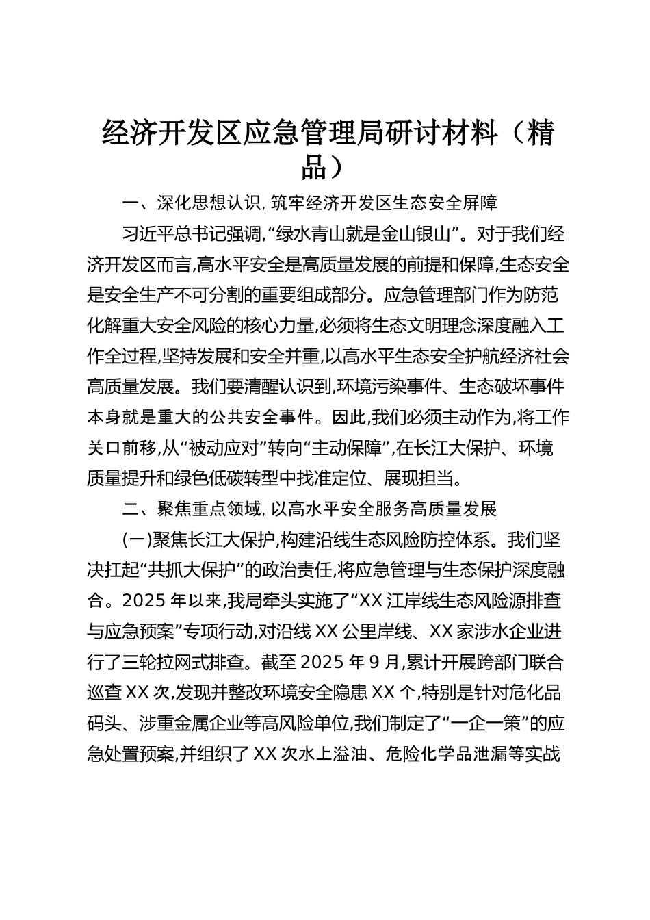 經(jīng)濟(jì)開發(fā)區(qū)應(yīng)急管理局研討材料(精品)一、深化思想認(rèn)識(shí),筑牢經(jīng)濟(jì)開發(fā)區(qū)生態(tài)安全屏障習(xí)近平總書記強(qiáng)調(diào),“”綠水青山就是金山銀山。對(duì)于我們經(jīng)濟(jì)開發(fā)區(qū)而言,高水平安全是高質(zhì)量發(fā)展的前提和保障,生態(tài)安全是安全生產(chǎn)不可分割的重要組成部分。應(yīng)急管理部門作為防范化解重大安全風(fēng)險(xiǎn)的核心力量,必須將生態(tài)文明理念深度融入工作全過程,堅(jiān)持發(fā)展和安全并重,以高水平生態(tài)安全護(hù)航經(jīng)濟(jì)社會(huì)高質(zhì)量發(fā)展。我們要清醒認(rèn)識(shí)到,環(huán)境污染事件、生態(tài)破壞事件本身就是重大的公共安全事件。因此,我們必須主動(dòng)作為,將工作關(guān)口前移,“”“”從被動(dòng)應(yīng)對(duì)轉(zhuǎn)向主動(dòng)保障,在長(zhǎng)江大保護(hù)、環(huán)境質(zhì)量提升...