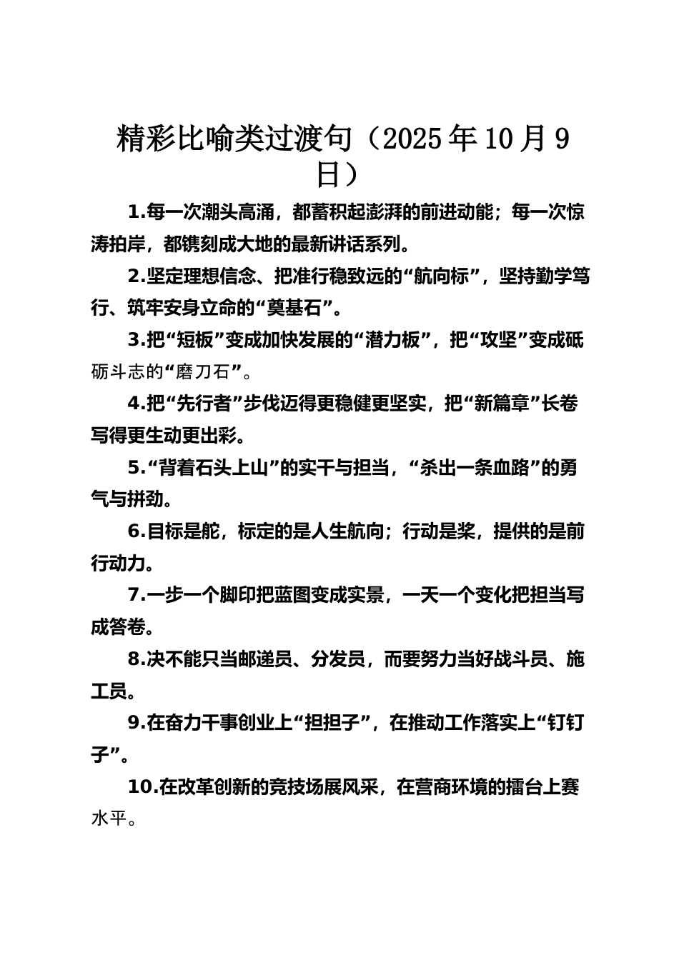 精彩比喻類過(guò)渡句(2025年10月9日)1.每一次潮頭高涌,都蓄積起澎湃的前進(jìn)動(dòng)能;每一次驚濤拍岸,都鐫刻成大地的最新講話系列。2.“”堅(jiān)定理想信念、把準(zhǔn)行穩(wěn)致遠(yuǎn)的航向標(biāo),堅(jiān)持勤學(xué)篤“”行、筑牢安身立命的奠基石。3.“”“”“”把短板變成加快發(fā)展的潛力板,把攻堅(jiān)變成砥“”礪斗志的磨刀石。4.“”“”把先行者步伐邁得更穩(wěn)健更堅(jiān)實(shí),把新篇章長(zhǎng)卷寫(xiě)得更生動(dòng)更出彩。5.“”“”背著石頭上山的實(shí)干與擔(dān)當(dāng),殺出一條血路的勇氣與拼勁。6.目標(biāo)是舵,標(biāo)定的是人生航向;行動(dòng)是槳,提供的是前行動(dòng)力。7.一步一個(gè)腳印把藍(lán)圖變成實(shí)景,一天一個(gè)變化把擔(dān)當(dāng)寫(xiě)成答卷。8.決不...