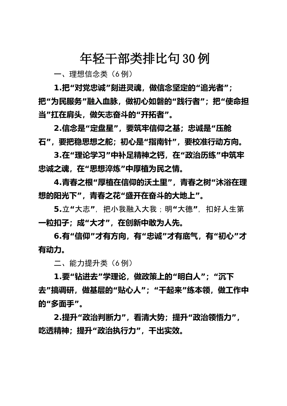 年輕干部類排比句30例一、理想信念類(6例)1.“”“”把對(duì)黨忠誠(chéng)刻進(jìn)靈魂,做信念堅(jiān)定的追光者;“”“”“把為民服務(wù)融入血脈,做初心如磐的踐行者;把使命擔(dān)”“”當(dāng)扛在肩頭,做矢志奮斗的開拓者。2.“”“信念是定盤星,要筑牢信仰之基;忠誠(chéng)是壓艙”“”石,要把穩(wěn)思想之舵;初心是指南針,要校準(zhǔn)行動(dòng)方向。3.“”“”在理論學(xué)習(xí)中補(bǔ)足精神之鈣,在政治歷練中筑牢“”忠誠(chéng)之魂,在思想淬煉中厚植為民之情。4.“”“青春之根厚植在信仰的沃土里,青春之樹沐浴在理”“”想的陽光下,青春之花盛開在奮斗的大地上。5.“”“”立大志,把小我融入大我;明大德,扣好人...