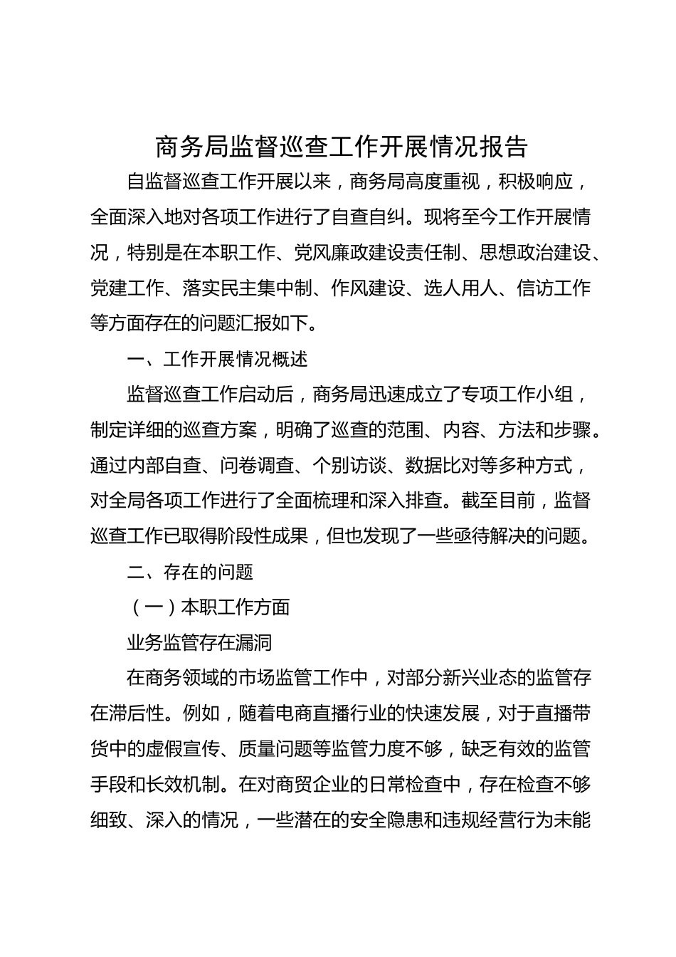 商務局監(jiān)督巡查工作開展情況報告自監(jiān)督巡查工作開展以來,商務局高度重視,積極響應,全面深入地對各項工作進行了自查自糾。現(xiàn)將至今工作開展情況,特別是在本職工作、黨風廉政建設責任制、思想政治建設、黨建工作、落實民主集中制、作風建設、選人用人、信訪工作等方面存在的問題匯報如下。一、工作開展情況概述監(jiān)督巡查工作啟動后,商務局迅速成立了專項工作小組,制定詳細的巡查方案,明確了巡查的范圍、內(nèi)容、方法和步驟。通過內(nèi)部自查、問卷調(diào)查、個別訪談、數(shù)據(jù)比對等多種方式,對全局各項工作進行了全面梳理和深入排查。截至目前,監(jiān)督巡查工作已取得階段性成果,...