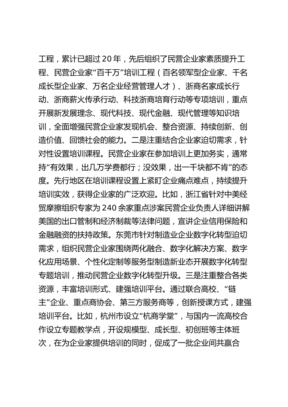先行地區(qū)民營企業(yè)家隊伍建設(shè)對我市的啟示民營企業(yè)家素質(zhì)是決定民營經(jīng)濟發(fā)展質(zhì)量的關(guān)鍵因素。為貫徹落實市委關(guān)于支持民營經(jīng)濟發(fā)展的決策部署,近期,市委政研室組織赴浙江、廣東等地開展專題調(diào)研,深入學(xué)習(xí)了先行地區(qū)在推動民營企業(yè)家隊伍建設(shè)方面的先進經(jīng)驗,現(xiàn)將有關(guān)情況報告如下。一、先行地區(qū)推動民營企業(yè)家隊伍建設(shè)的做法以浙江、廣東為代表的先行地區(qū)把民營企業(yè)家作為推動經(jīng)濟發(fā)展的最寶貴財富和贏得市場競爭的最關(guān)鍵因素,注重保護和弘揚民營企業(yè)家精神,傾聽和解決民營企業(yè)家訴求,支持和引導(dǎo)民營企業(yè)家素質(zhì)提升,與民營企業(yè)家想在一起、站在一起、干在一起,建成...