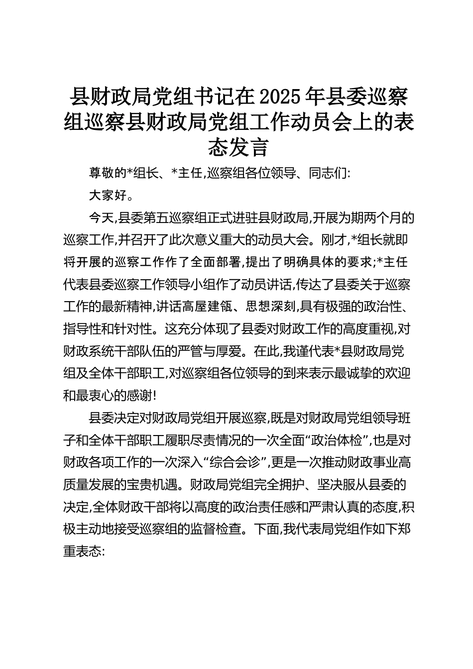 縣財(cái)政局黨組書記在2025年縣委巡察組巡察縣財(cái)政局黨組工作動(dòng)員會(huì)上的表態(tài)發(fā)言尊敬的*組長、*主任,巡察組各位領(lǐng)導(dǎo)、同志們:大家好。今天,縣委第五巡察組正式進(jìn)駐縣財(cái)政局,開展為期兩個(gè)月的巡察工作,并召開了此次意義重大的動(dòng)員大會(huì)。剛才,*組長就即將開展的巡察工作作了全面部署,提出了明確具體的要求;*主任代表縣委巡察工作領(lǐng)導(dǎo)小組作了動(dòng)員講話,傳達(dá)了縣委關(guān)于巡察工作的最新精神,講話高屋建瓴、思想深刻,具有極強(qiáng)的政治性、指導(dǎo)性和針對(duì)性。這充分體現(xiàn)了縣委對(duì)財(cái)政工作的高度重視,對(duì)財(cái)政系統(tǒng)干部隊(duì)伍的嚴(yán)管與厚愛。在此,我謹(jǐn)代表*縣財(cái)政局黨組及全體干部職工,對(duì)巡察組...