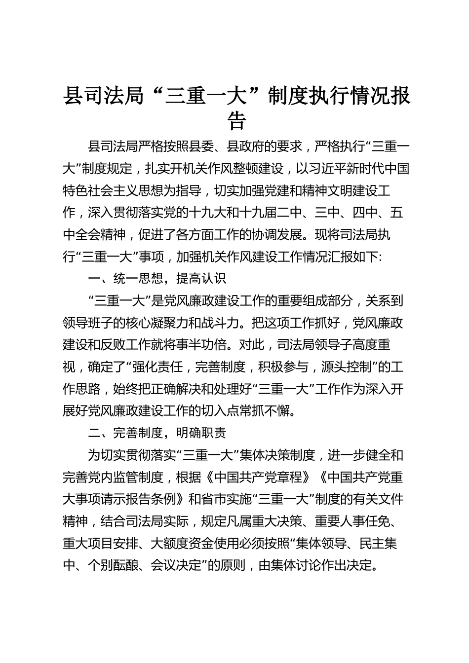縣司法局“三重一大”制度執(zhí)行情況報(bào)告“縣司法局嚴(yán)格按照縣委、縣政府的要求,嚴(yán)格執(zhí)行三重一”大制度規(guī)定,扎實(shí)開機(jī)關(guān)作風(fēng)整頓建設(shè),以習(xí)近平新時(shí)代中國(guó)特色社會(huì)主義思想為指導(dǎo),切實(shí)加強(qiáng)黨建和精神文明建設(shè)工作,深入貫徹落實(shí)黨的十九大和十九屆二中、三中、四中、五中全會(huì)精神,促進(jìn)了各方面工作的協(xié)調(diào)發(fā)展。現(xiàn)將司法局執(zhí)“”行三重一大事項(xiàng),加強(qiáng)機(jī)關(guān)作風(fēng)建設(shè)工作情況匯報(bào)如下:一、統(tǒng)一思想,提高認(rèn)識(shí)“”三重一大是黨風(fēng)廉政建設(shè)工作的重要組成部分,關(guān)系到領(lǐng)導(dǎo)班子的核心凝聚力和戰(zhàn)斗力。把這項(xiàng)工作抓好,黨風(fēng)廉政建設(shè)和反敗工作就將事半功倍。對(duì)此,司法局領(lǐng)導(dǎo)子...
