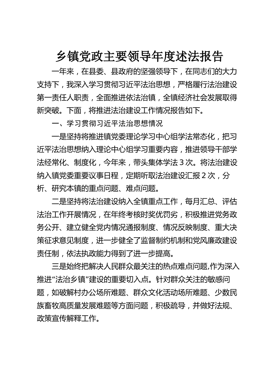 鄉(xiāng)鎮(zhèn)黨政主要領導年度述法報告一年來,在縣委、縣政府的堅強領導下,在同志們的大力支持下,我深入學習貫徹習近平法治思想,嚴格履行法治建設第一責任人職責,全面推進依法治鎮(zhèn),全鎮(zhèn)經濟社會發(fā)展取得新突破。下面,將推進法治建設工作情況報告如下。一、學習貫徹習近平法治思想情況一是堅持將推進鎮(zhèn)黨委理論學習中心組學法常態(tài)化,把習近平法治思想納入理論中心組學習重要內容,推進領導干部學法經常化、制度化,今年來,帶頭集體學法3次。將法治建設納入鎮(zhèn)黨委重要議事日程,定期聽取法治建設匯報2次,分析、研究本鎮(zhèn)的重點問題、難點問題。二是堅持將法治建設納入全鎮(zhèn)...
