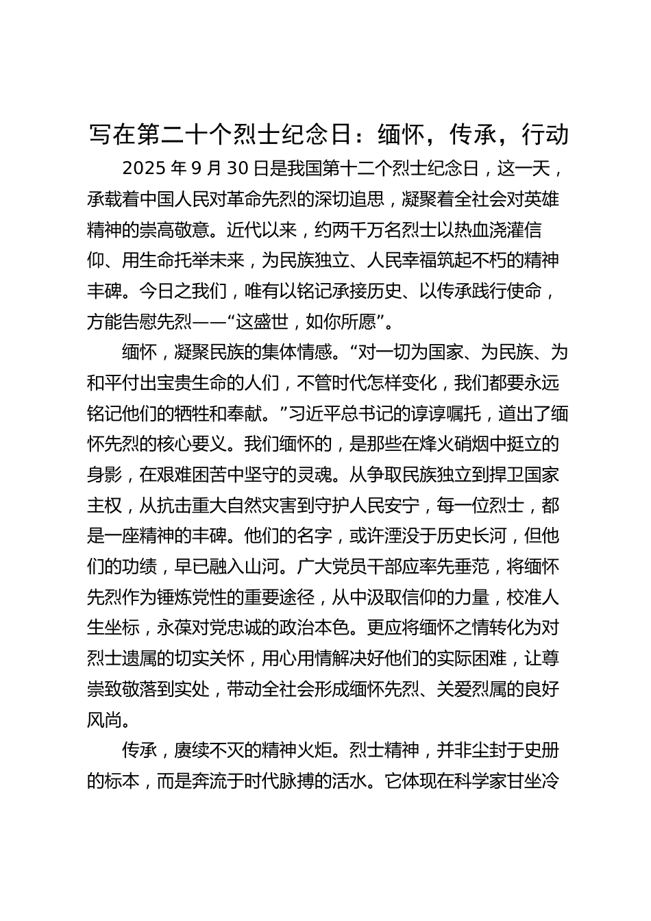 寫在第二十個烈士紀念日:緬懷,傳承,行動2025年9月30日是我國第十二個烈士紀念日,這一天,承載著中國人民對革命先烈的深切追思,凝聚著全社會對英雄精神的崇高敬意。近代以來,約兩千萬名烈士以熱血澆灌信仰、用生命托舉未來,為民族獨立、人民幸福筑起不朽的精神豐碑。今日之我們,唯有以銘記承接歷史、以傳承踐行使命,——“”方能告慰先烈這盛世,如你所愿。“緬懷,凝聚民族的集體情感。對一切為國家、為民族、為和平付出寶貴生命的人們,不管時代怎樣變化,我們都要永遠”銘記他們的犧牲和奉獻。習近平總書記的諄諄囑托,道出了緬懷先烈的核心要義。我們緬懷的...