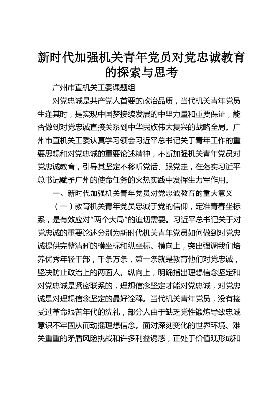 新時代加強機關(guān)青年黨員對黨忠誠教育的探索與思考廣州市直機關(guān)工委課題組對黨忠誠是共產(chǎn)黨人首要的政治品質(zhì),當(dāng)代機關(guān)青年黨員生逢其時,是實現(xiàn)中國夢接續(xù)發(fā)展的中堅力量和重要保證,能否做到對黨忠誠直接關(guān)系到中華民族偉大復(fù)興的戰(zhàn)略全局。廣州市直機關(guān)工委認(rèn)真學(xué)習(xí)領(lǐng)會習(xí)近平總書記關(guān)于青年工作的重要思想和對黨忠誠的重要論述精神,不斷加強機關(guān)青年黨員對黨忠誠教育,引導(dǎo)其堅定不移聽黨話、跟黨走,在落實習(xí)近平總書記賦予廣州的使命任務(wù)的火熱實踐中發(fā)揮生力軍作用。一、新時代加強機關(guān)青年黨員對黨忠誠教育的重大意義(一)教育機關(guān)青年黨員忠誠于黨的信仰,定準(zhǔn)...