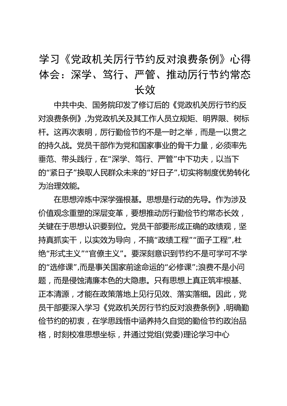 學(xué)習(xí)《黨政機(jī)關(guān)厲行節(jié)約反對浪費條例》心得體會:深學(xué)、篤行、嚴(yán)管、推動厲行節(jié)約常態(tài)長效