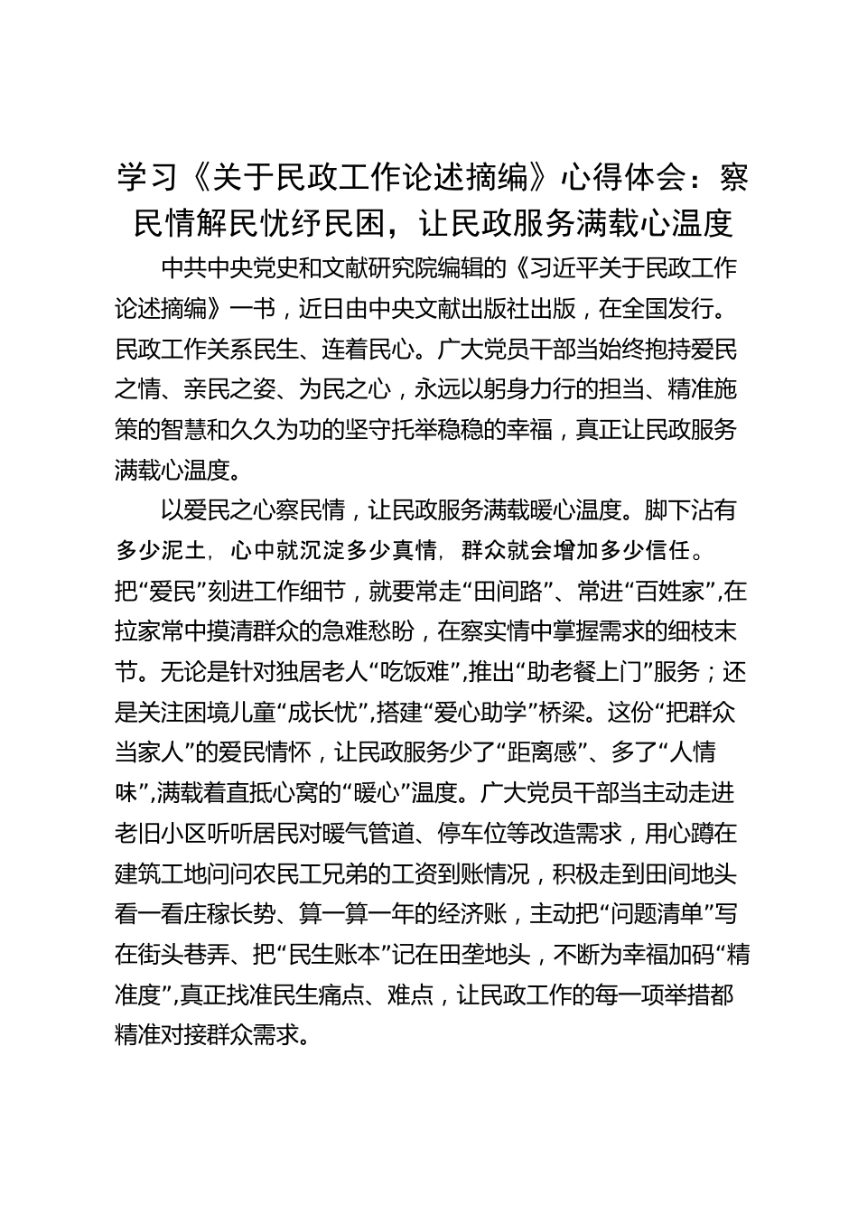 學(xué)習(xí)《關(guān)于民政工作論述摘編》心得體會:察民情解民憂紓民困,讓民政服務(wù)滿載心溫度