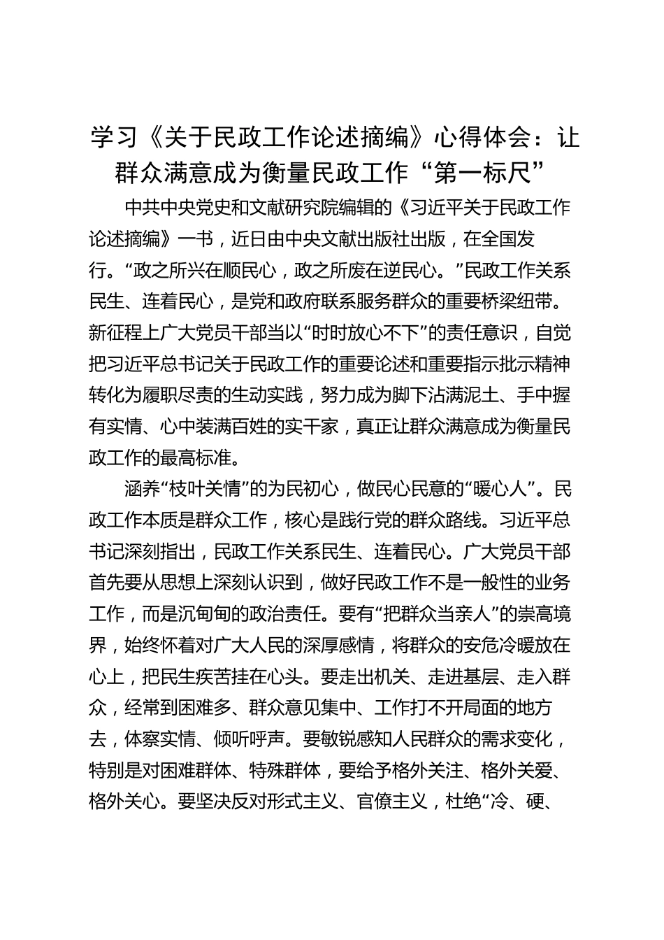 學習《關(guān)于民政工作論述摘編》心得體會:讓群眾滿意成為衡量民政工作“第一標尺”