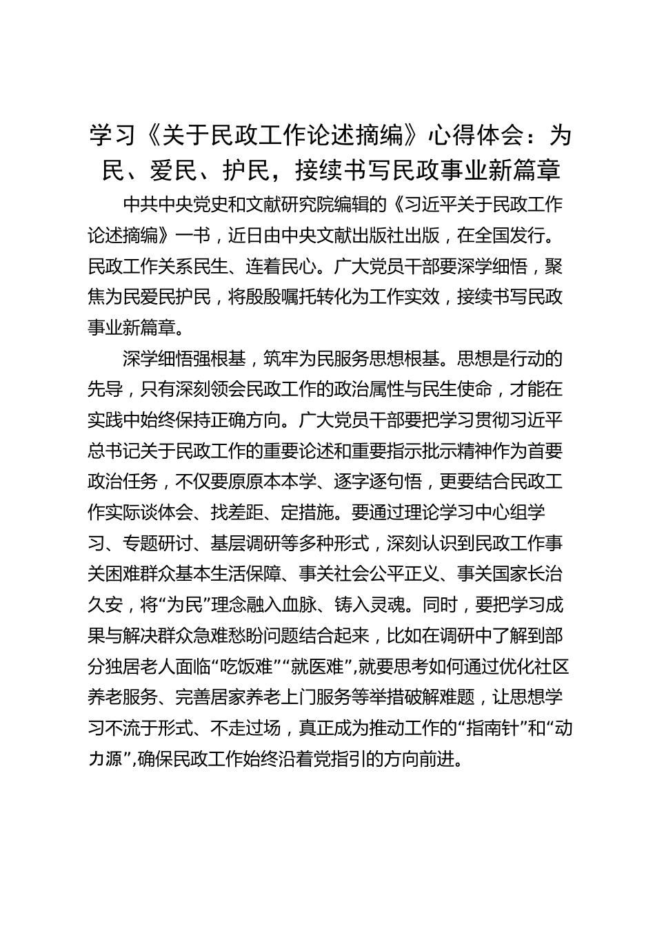 學(xué)習(xí)《關(guān)于民政工作論述摘編》心得體會(huì):為民、愛(ài)民、護(hù)民,接續(xù)書(shū)寫(xiě)民政事業(yè)新篇章