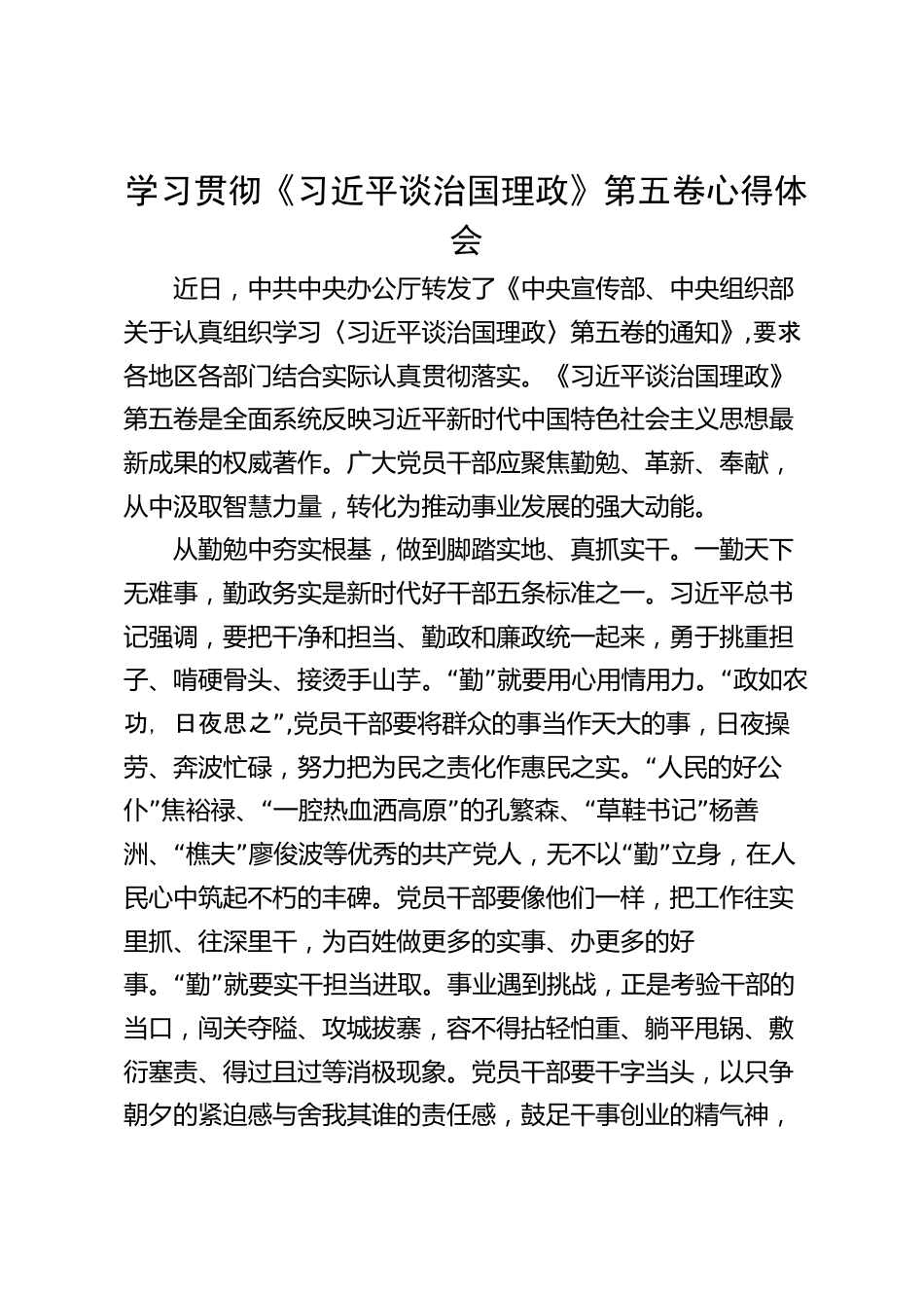 學(xué)習(xí)貫徹《習(xí)近平談治國(guó)理政》第五卷心得體會(huì)近日,中共中央辦公廳轉(zhuǎn)發(fā)了《中央宣傳部、中央組織部關(guān)于認(rèn)真組織學(xué)習(xí)〈習(xí)近平談治國(guó)理政〉第五卷的通知》,要求各地區(qū)各部門(mén)結(jié)合實(shí)際認(rèn)真貫徹落實(shí)。《習(xí)近平談治國(guó)理政》第五卷是全面系統(tǒng)反映習(xí)近平新時(shí)代中國(guó)特色社會(huì)主義思想最新成果的權(quán)威著作。廣大黨員干部應(yīng)聚焦勤勉、革新、奉獻(xiàn),從中汲取智慧力量,轉(zhuǎn)化為推動(dòng)事業(yè)發(fā)展的強(qiáng)大動(dòng)能。從勤勉中夯實(shí)根基,做到腳踏實(shí)地、真抓實(shí)干。一勤天下無(wú)難事,勤政務(wù)實(shí)是新時(shí)代好干部五條標(biāo)準(zhǔn)之一。習(xí)近平總書(shū)記強(qiáng)調(diào),要把干凈和擔(dān)當(dāng)、勤政和廉政統(tǒng)一起來(lái),勇于挑重?fù)?dān)“”“子、啃硬...