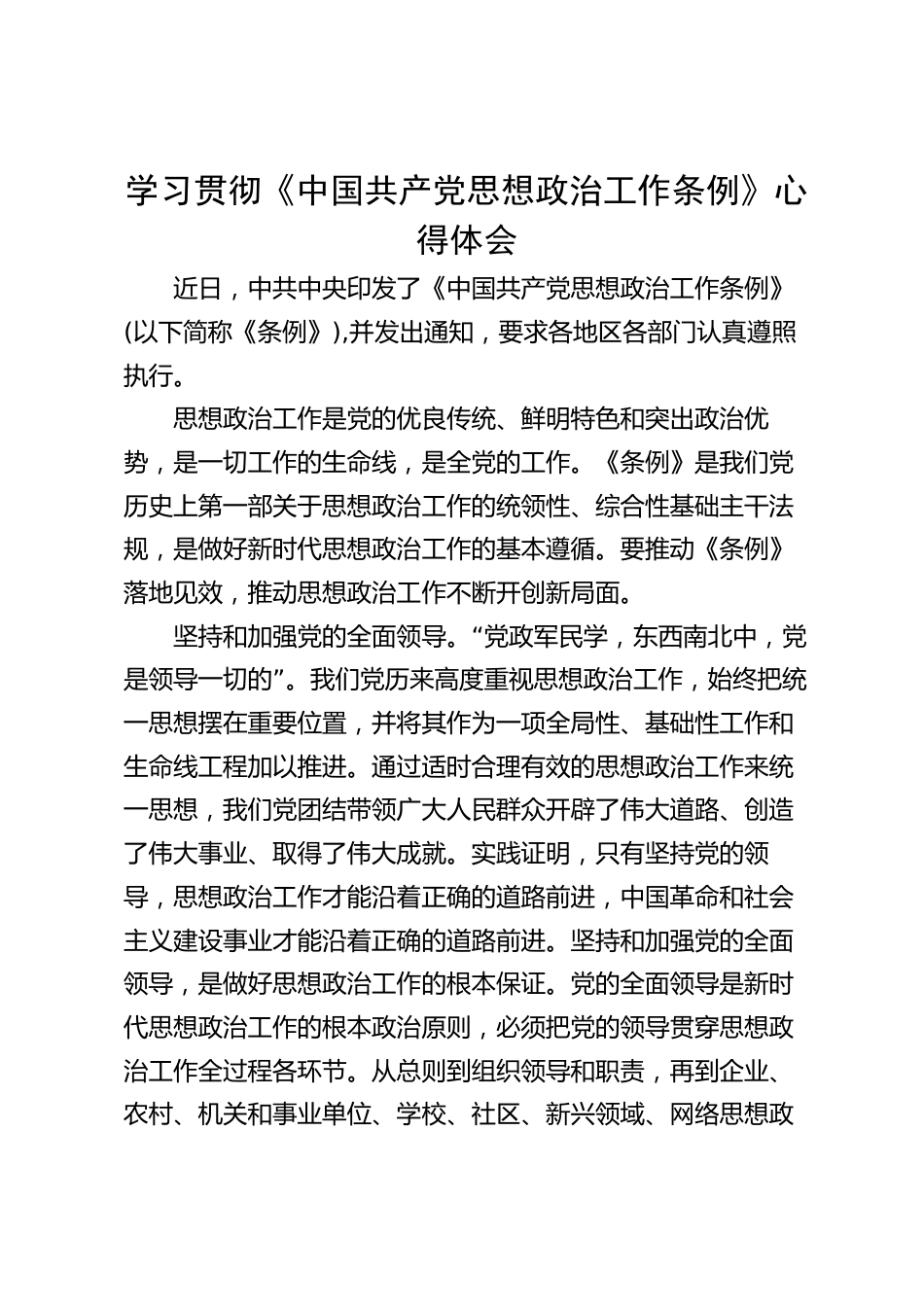 學(xué)習(xí)貫徹《中國(guó)共產(chǎn)黨思想政治工作條例》心得體會(huì)近日,中共中央印發(fā)了《中國(guó)共產(chǎn)黨思想政治工作條例》(以下簡(jiǎn)稱(chēng)《條例》),并發(fā)出通知,要求各地區(qū)各部門(mén)認(rèn)真遵照?qǐng)?zhí)行。思想政治工作是黨的優(yōu)良傳統(tǒng)、鮮明特色和突出政治優(yōu)勢(shì),是一切工作的生命線(xiàn),是全黨的工作?!稐l例》是我們黨歷史上第一部關(guān)于思想政治工作的統(tǒng)領(lǐng)性、綜合性基礎(chǔ)主干法規(guī),是做好新時(shí)代思想政治工作的基本遵循。要推動(dòng)《條例》落地見(jiàn)效,推動(dòng)思想政治工作不斷開(kāi)創(chuàng)新局面。“堅(jiān)持和加強(qiáng)黨的全面領(lǐng)導(dǎo)。黨政軍民學(xué),東西南北中,黨”是領(lǐng)導(dǎo)一切的。我們黨歷來(lái)高度重視思想政治工作,始終把統(tǒng)一思想擺在重...