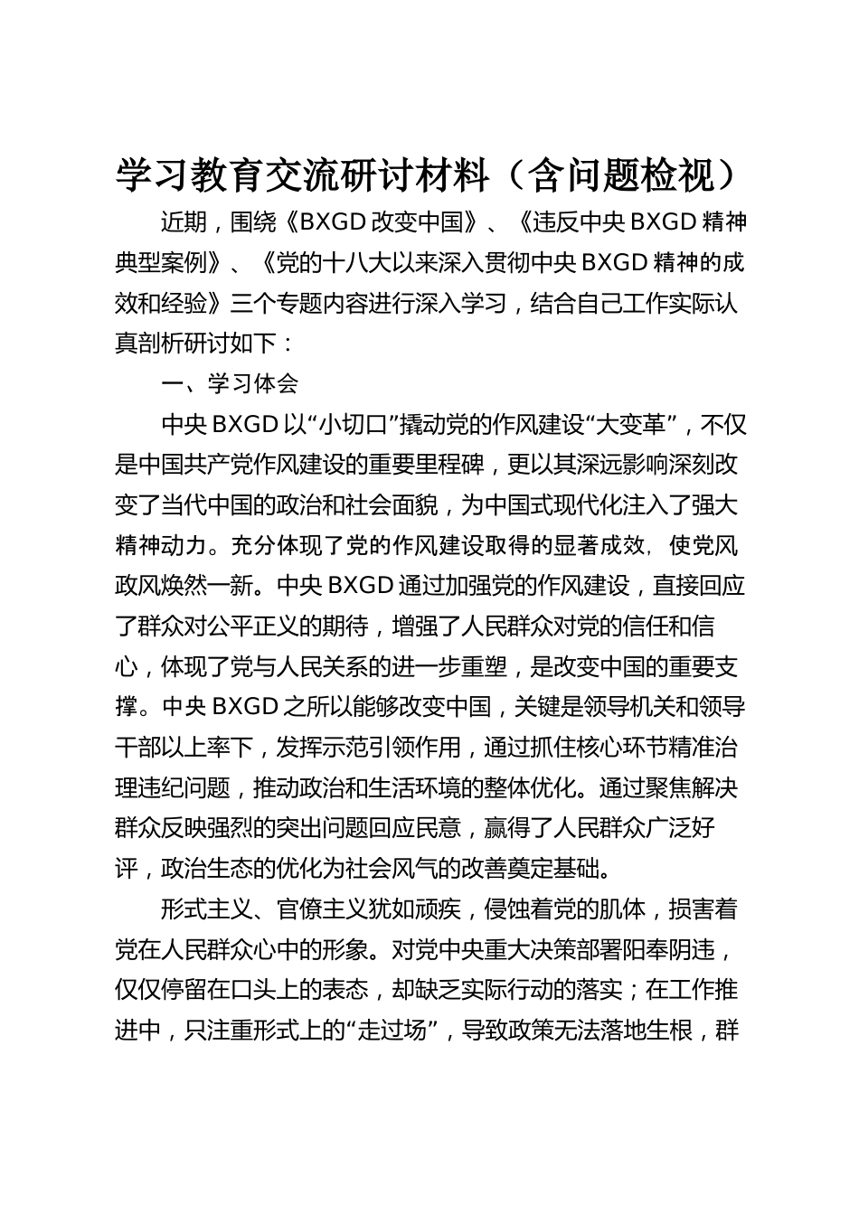 學(xué)習(xí)教育交流研討材料(含問題檢視)近期,圍繞《BXGD改變中國》、《違反中央BXGD精神典型案例》、《黨的十八大以來深入貫徹中央BXGD精神的成效和經(jīng)驗》三個專題內(nèi)容進(jìn)行深入學(xué)習(xí),結(jié)合自己工作實際認(rèn)真剖析研討如下:一、學(xué)習(xí)體會中央BXGD“”“”以小切口撬動黨的作風(fēng)建設(shè)大變革,不僅是中國共產(chǎn)黨作風(fēng)建設(shè)的重要里程碑,更以其深遠(yuǎn)影響深刻改變了當(dāng)代中國的政治和社會面貌,為中國式現(xiàn)代化注入了強大精神力。充分體了黨的作建取得的著成效,使黨動現(xiàn)風(fēng)設(shè)顯風(fēng)政風(fēng)煥然一新。中央BXGD通過加強黨的作風(fēng)建設(shè),直接回應(yīng)了群眾對公平正義的期待,增強了人民群眾對黨的信任和...