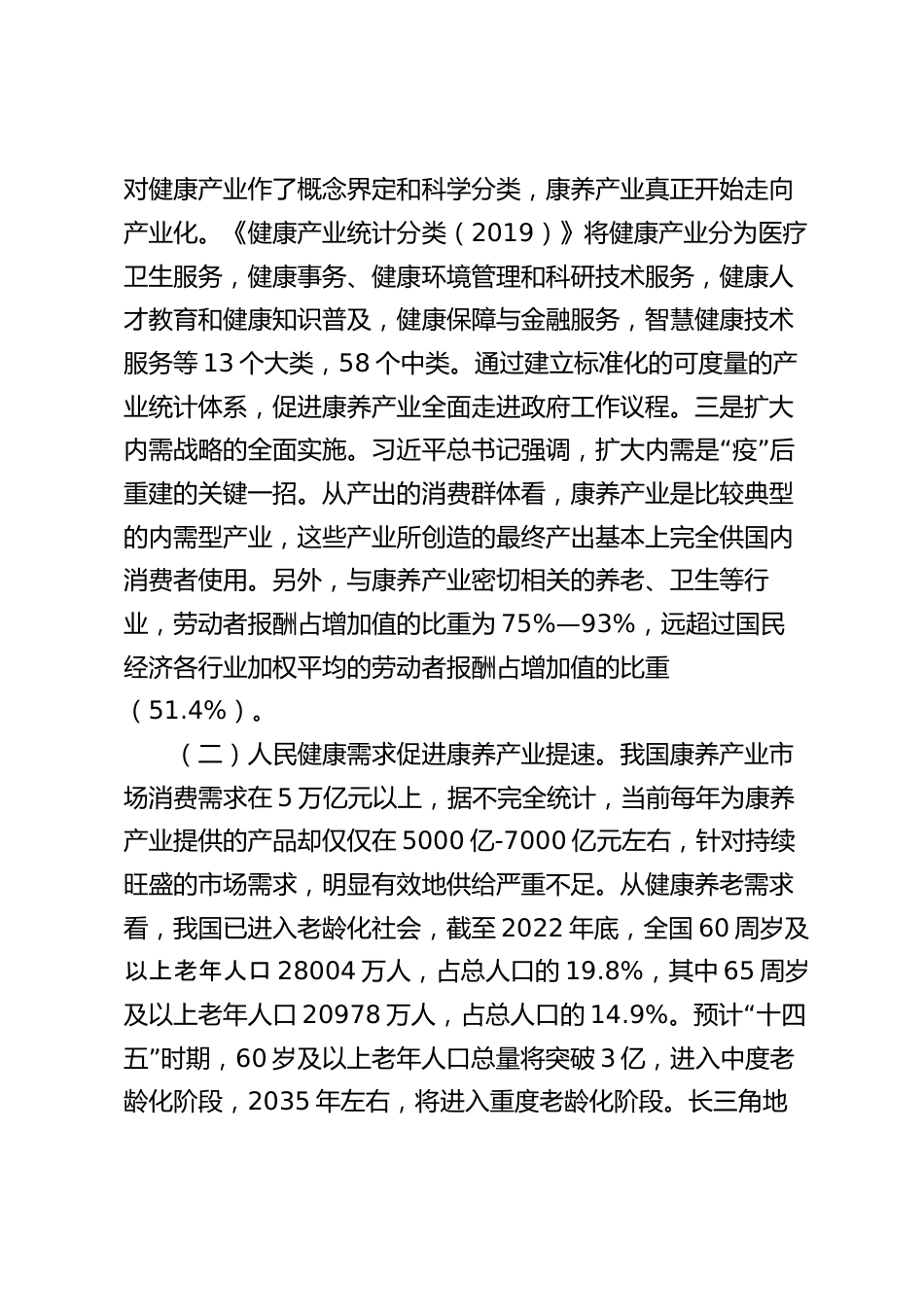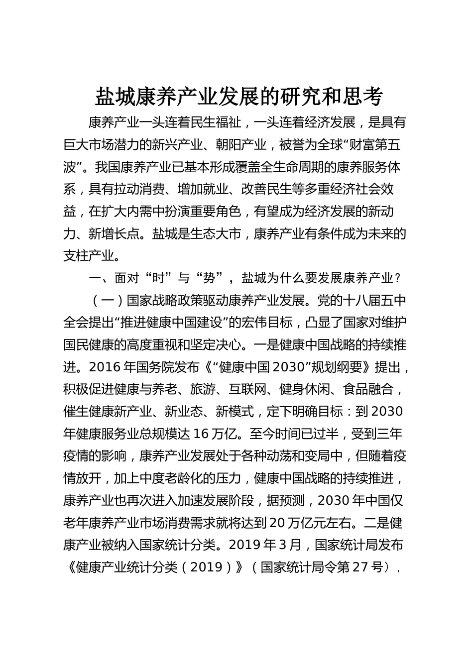 鹽城康養(yǎng)產(chǎn)業(yè)發(fā)展的研究和思考康養(yǎng)產(chǎn)業(yè)一頭連著民生福祉,一頭連著經(jīng)濟(jì)發(fā)展,是具有“巨大市場潛力的新興產(chǎn)業(yè)、朝陽產(chǎn)業(yè),被譽(yù)為全球財(cái)富第五”波。我國康養(yǎng)產(chǎn)業(yè)已基本形成覆蓋全生命周期的康養(yǎng)服務(wù)體系,具有拉動消費(fèi)、增加就業(yè)、改善民生等多重經(jīng)濟(jì)社會效益,在擴(kuò)大內(nèi)需中扮演重要角色,有望成為經(jīng)濟(jì)發(fā)展的新動力、新增長點(diǎn)。鹽城是生態(tài)大市,康養(yǎng)產(chǎn)業(yè)有條件成為未來的支柱產(chǎn)業(yè)。一、面對“時(shí)”與“勢”,鹽城為什么要發(fā)展康養(yǎng)產(chǎn)業(yè)?(一)國家戰(zhàn)略政策驅(qū)動康養(yǎng)產(chǎn)業(yè)發(fā)展。黨的十八屆五中“”全會提出推進(jìn)健康中國建設(shè)的宏偉目標(biāo),凸顯了國家對維護(hù)國民健康的高度重視和...