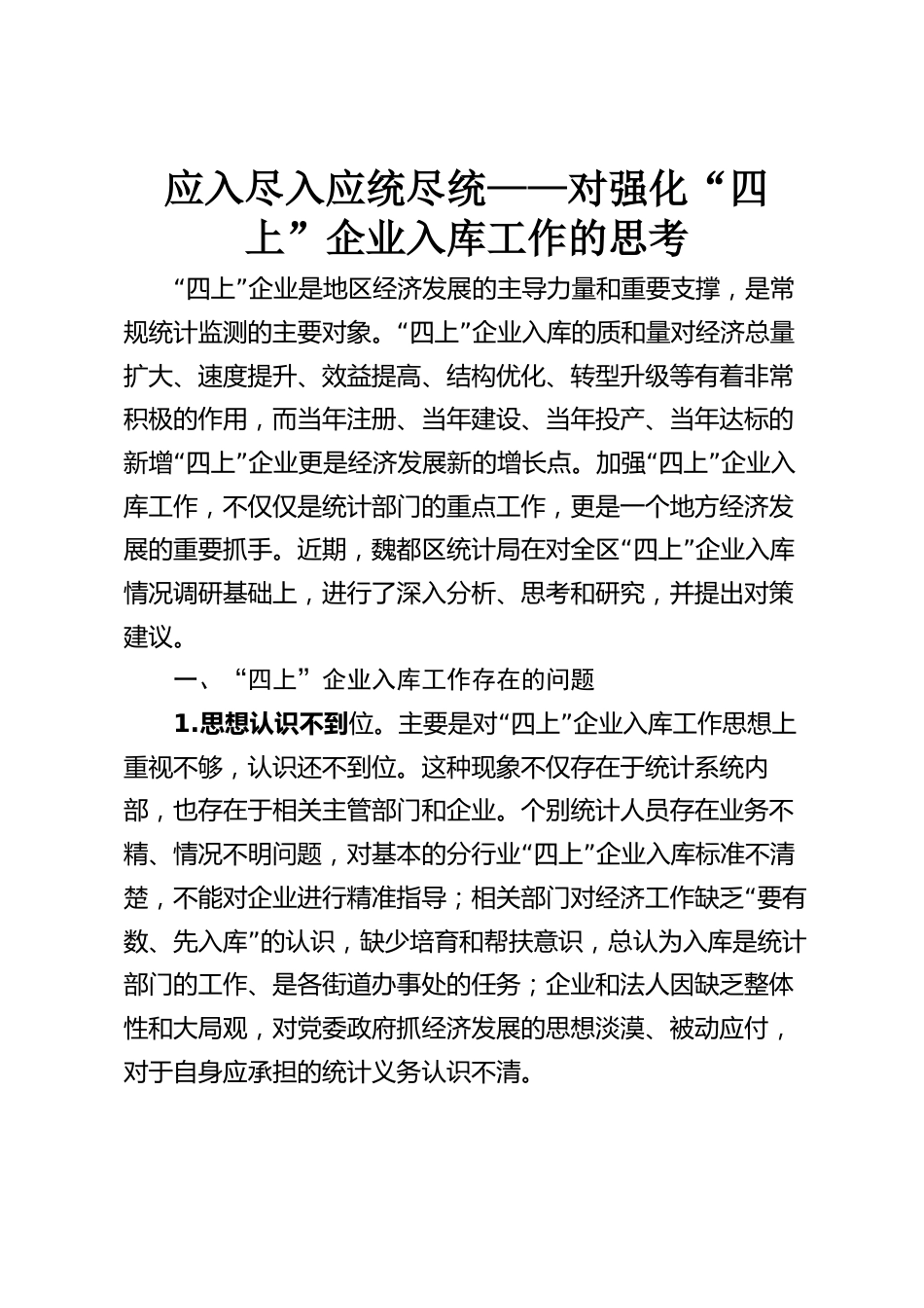 應(yīng)入盡入應(yīng)統(tǒng)盡統(tǒng)——對強化“四上”企業(yè)入庫工作的思考“”四上企業(yè)是地區(qū)經(jīng)濟發(fā)展的主導(dǎo)力量和重要支撐,是?!啊币?guī)統(tǒng)計監(jiān)測的主要對象。四上企業(yè)入庫的質(zhì)和量對經(jīng)濟總量擴大、速度提升、效益提高、結(jié)構(gòu)優(yōu)化、轉(zhuǎn)型升級等有著非常積極的作用,而當年注冊、當年建設(shè)、當年投產(chǎn)、當年達標的“”“”新增四上企業(yè)更是經(jīng)濟發(fā)展新的增長點。加強四上企業(yè)入庫工作,不僅僅是統(tǒng)計部門的重點工作,更是一個地方經(jīng)濟發(fā)“”展的重要抓手。近期,魏都區(qū)統(tǒng)計局在對全區(qū)四上企業(yè)入庫情況調(diào)研基礎(chǔ)上,進行了深入分析、思考和研究,并提出對策建議。一、“四上”企業(yè)入庫工作存在的問題...