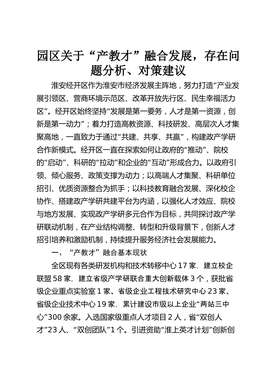園區(qū)關(guān)于“產(chǎn)教才”融合發(fā)展,存在問題分析、對(duì)策建議