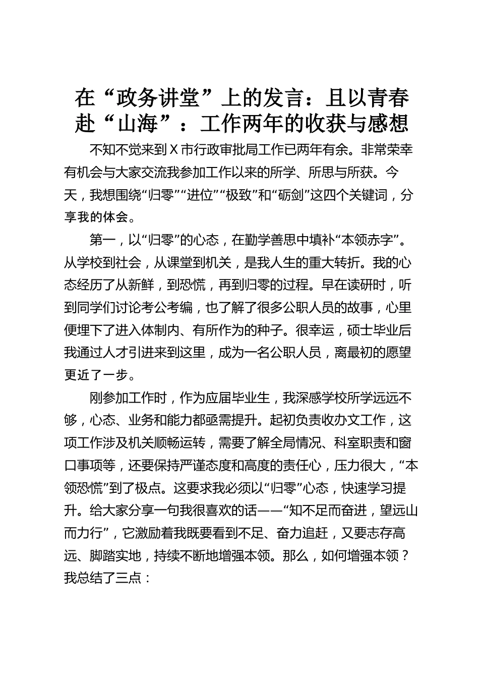 在“政務(wù)講堂”上的發(fā)言:且以青春赴“山?!保汗ぷ鲀赡甑氖斋@與感想不知不覺來到X市行政審批局工作已兩年有余。非常榮幸有機(jī)會(huì)與大家交流我參加工作以來的所學(xué)、所思與所獲。今“”“”“”“”天,我想圍繞歸零進(jìn)位極致和礪劍這四個(gè)關(guān)鍵詞,分享我的體會(huì)。“”“”第一,以歸零的心態(tài),在勤學(xué)善思中填補(bǔ)本領(lǐng)赤字。從學(xué)校到社會(huì),從課堂到機(jī)關(guān),是我人生的重大轉(zhuǎn)折。我的心態(tài)經(jīng)歷了從新鮮,到恐慌,再到歸零的過程。早在讀研時(shí),聽到同學(xué)們討論考公考編,也了解了很多公職人員的故事,心里便埋下了進(jìn)入體制內(nèi)、有所作為的種子。很幸運(yùn),碩士畢業(yè)后我通過人才引進(jìn)來到這...