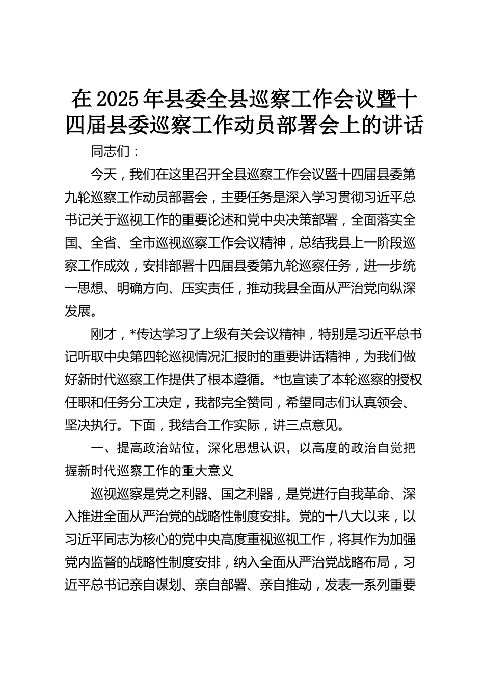 在2025年縣委全縣巡察工作會(huì)議暨十四屆縣委巡察工作動(dòng)員部署會(huì)上的講話