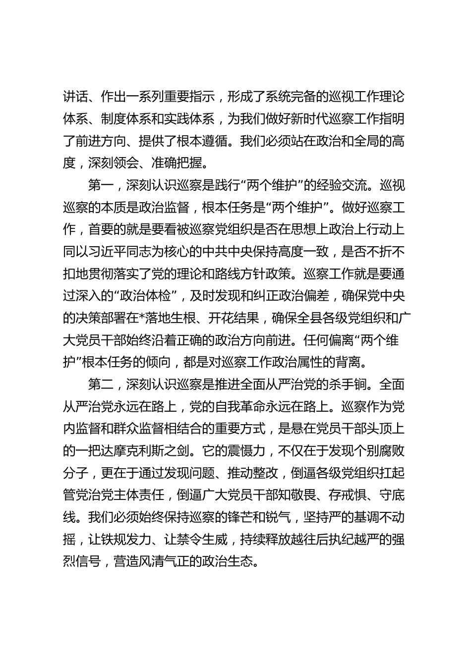 在2025年縣委全縣巡察工作會(huì)議暨十四屆縣委巡察工作動(dòng)員部署會(huì)上的講話同志們:今天,我們?cè)谶@里召開全縣巡察工作會(huì)議暨十四屆縣委第九輪巡察工作動(dòng)員部署會(huì),主要任務(wù)是深入學(xué)習(xí)貫徹習(xí)近平總書記關(guān)于巡視工作的重要論述和黨中央決策部署,全面落實(shí)全國、全省、全市巡視巡察工作會(huì)議精神,總結(jié)我縣上一階段巡察工作成效,安排部署十四屆縣委第九輪巡察任務(wù),進(jìn)一步統(tǒng)一思想、明確方向、壓實(shí)責(zé)任,推動(dòng)我縣全面從嚴(yán)治黨向縱深發(fā)展。剛才,*傳達(dá)學(xué)習(xí)了上級(jí)有關(guān)會(huì)議精神,特別是習(xí)近平總書記聽取中央第四輪巡視情況匯報(bào)時(shí)的重要講話精神,為我們做好新時(shí)代巡察工作提供了根...