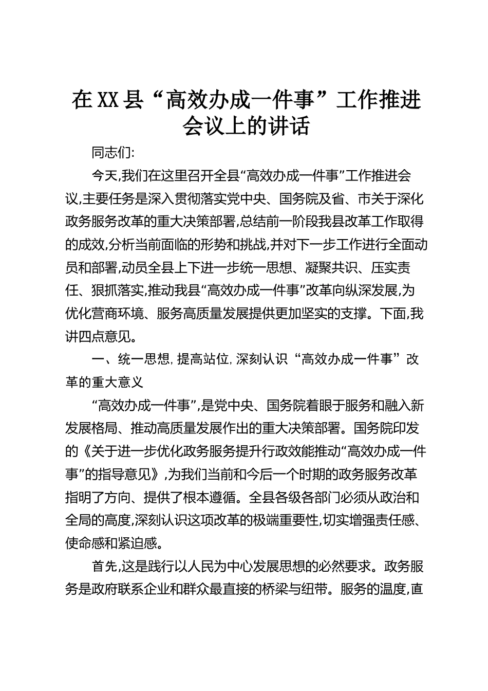 在XX縣“高效辦成一件事”工作推進(jìn)會議上的講話同志們:今天,“”我們在這里召開全縣高效辦成一件事工作推進(jìn)會議,主要任務(wù)是深入貫徹落實黨中央、國務(wù)院及省、市關(guān)于深化政務(wù)服務(wù)改革的重大決策部署,總結(jié)前一階段我縣改革工作取得的成效,分析當(dāng)前面臨的形勢和挑戰(zhàn),并對下一步工作進(jìn)行全面動員和部署,動員全縣上下進(jìn)一步統(tǒng)一思想、凝聚共識、壓實責(zé)任、狠抓落實,“”推動我縣高效辦成一件事改革向縱深發(fā)展,為優(yōu)化營商環(huán)境、服務(wù)高質(zhì)量發(fā)展提供更加堅實的支撐。下面,我講四點(diǎn)意見。一、統(tǒng)一思想,提高站位,深刻認(rèn)識“高效辦成一件事”改革的重大意義“”高效辦成一件事,是黨...