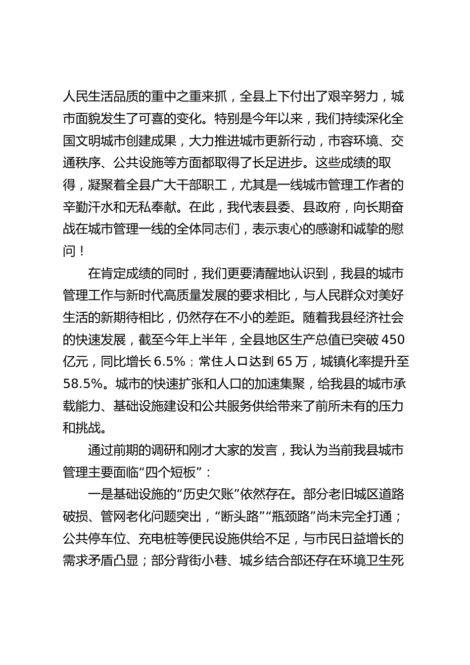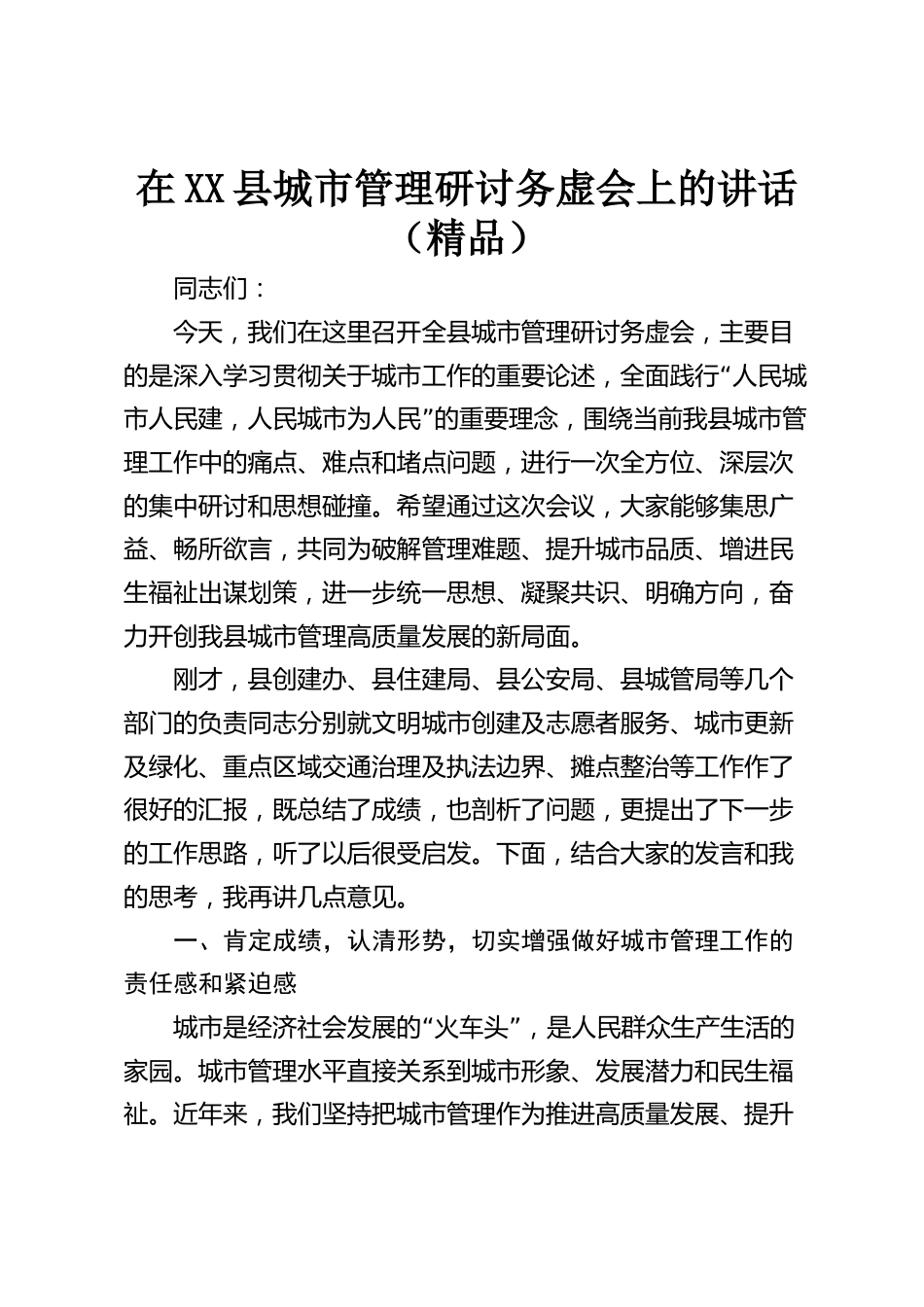 在XX縣城市管理研討務(wù)虛會(huì)上的講話(huà)(精品)同志們:今天,我們?cè)谶@里召開(kāi)全縣城市管理研討務(wù)虛會(huì),主要目“的是深入學(xué)習(xí)貫徹關(guān)于城市工作的重要論述,全面踐行人民城”市人民建,人民城市為人民的重要理念,圍繞當(dāng)前我縣城市管理工作中的痛點(diǎn)、難點(diǎn)和堵點(diǎn)問(wèn)題,進(jìn)行一次全方位、深層次的集中研討和思想碰撞。希望通過(guò)這次會(huì)議,大家能夠集思廣益、暢所欲言,共同為破解管理難題、提升城市品質(zhì)、增進(jìn)民生福祉出謀劃策,進(jìn)一步統(tǒng)一思想、凝聚共識(shí)、明確方向,奮力開(kāi)創(chuàng)我縣城市管理高質(zhì)量發(fā)展的新局面。剛才,縣創(chuàng)建辦、縣住建局、縣公安局、縣城管局等幾個(gè)部門(mén)的負(fù)責(zé)同志分...