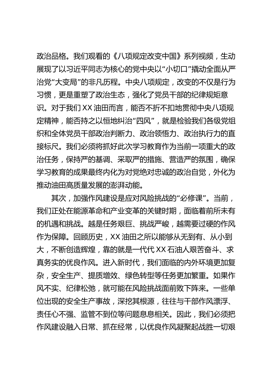 在XX油田黨委理論學(xué)習(xí)中心組集體學(xué)習(xí)會(huì)上的講話(精品)同志們:今天,我們召開(kāi)油田黨委理論學(xué)習(xí)中心組集體學(xué)習(xí)會(huì),主要任務(wù)是深入學(xué)習(xí)領(lǐng)會(huì)《習(xí)近平關(guān)于加強(qiáng)黨的作風(fēng)建設(shè)論述摘編》,傳達(dá)學(xué)習(xí)習(xí)近平總書記近期系列重要講話和重要指示精“神,并結(jié)合上級(jí)通報(bào)的典型案例和我們自身查擺的兩個(gè)清”單,進(jìn)行一次深刻的專題研討。這既是一次凝心鑄魂的理論學(xué)習(xí),也是一次正風(fēng)肅紀(jì)的警示教育,更是一次推動(dòng)工作的再動(dòng)員、再部署。作風(fēng)建設(shè)永遠(yuǎn)在路上,全面從嚴(yán)治黨永遠(yuǎn)在路上。剛才,幾位同志分別領(lǐng)學(xué)了相關(guān)內(nèi)容,大家也觀看了學(xué)習(xí)視頻,張波同志結(jié)合工作實(shí)際交流了學(xué)習(xí)體會(huì),講...